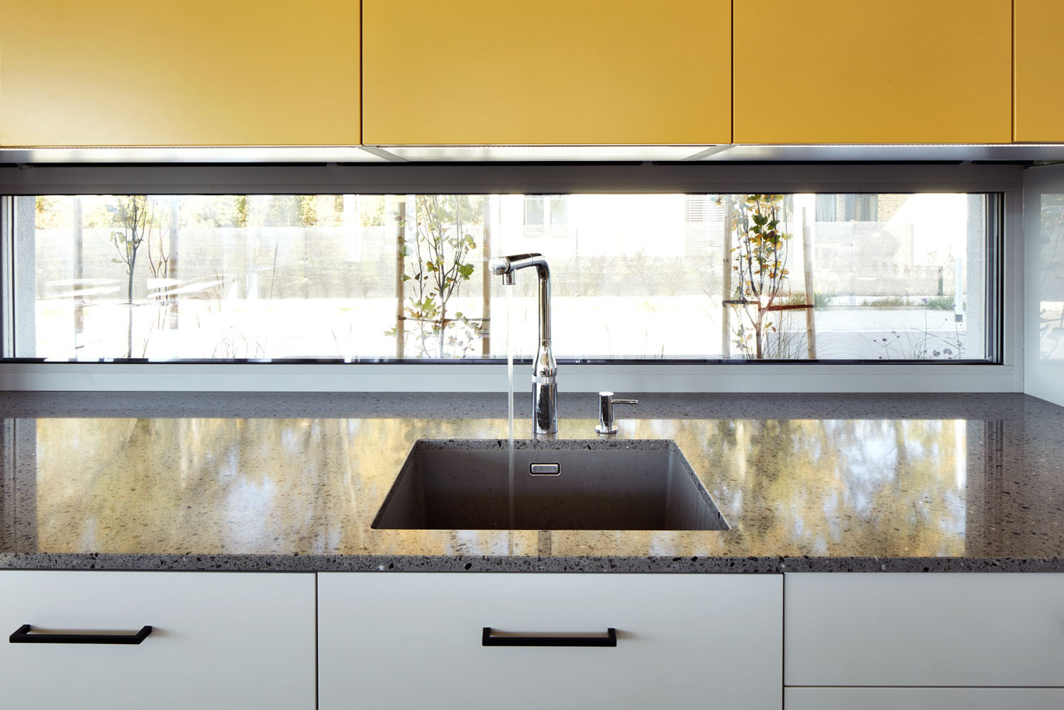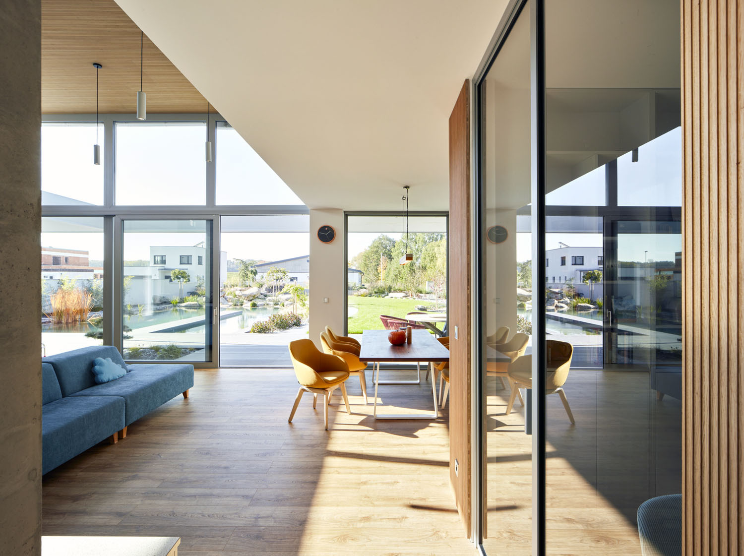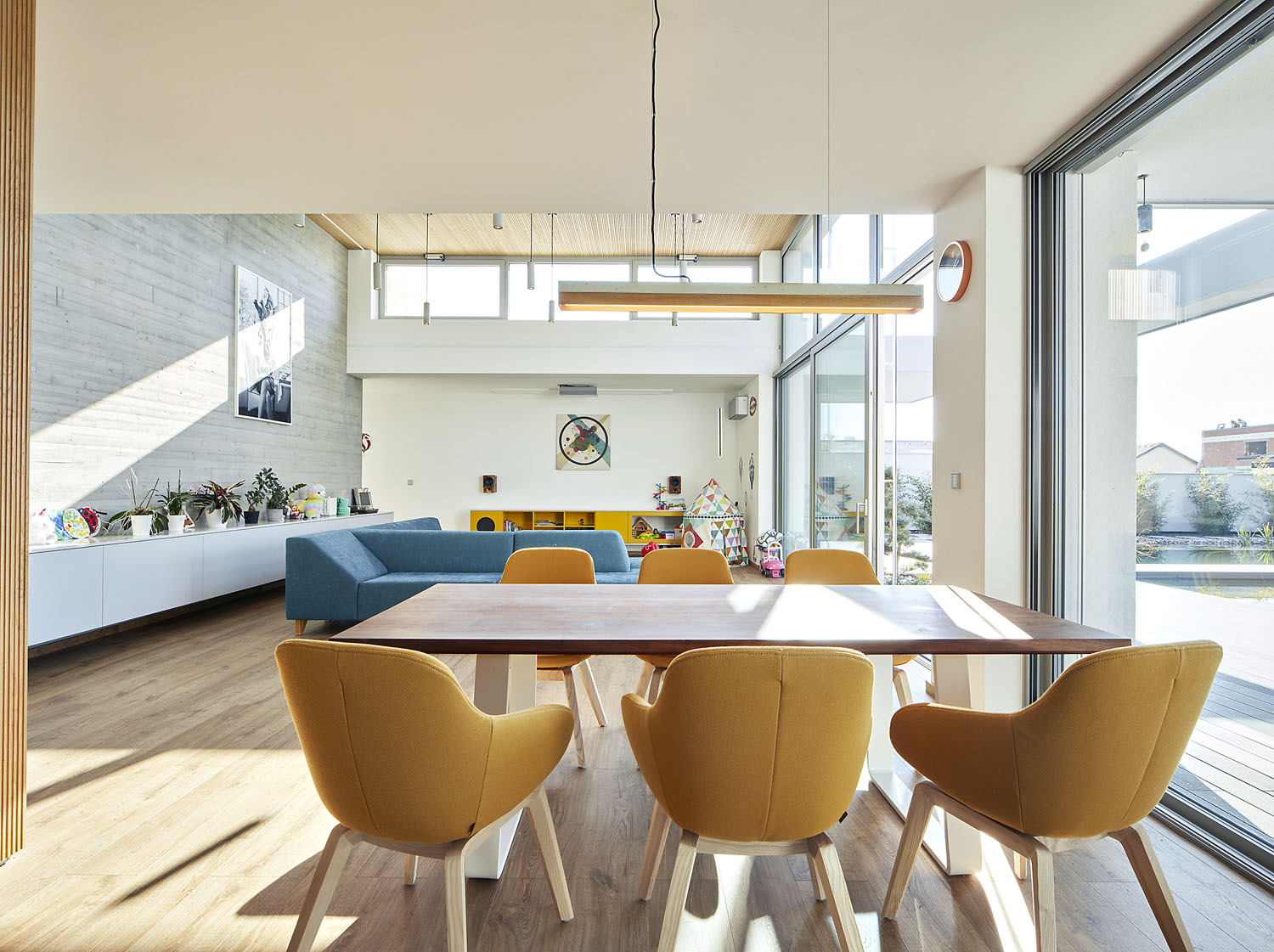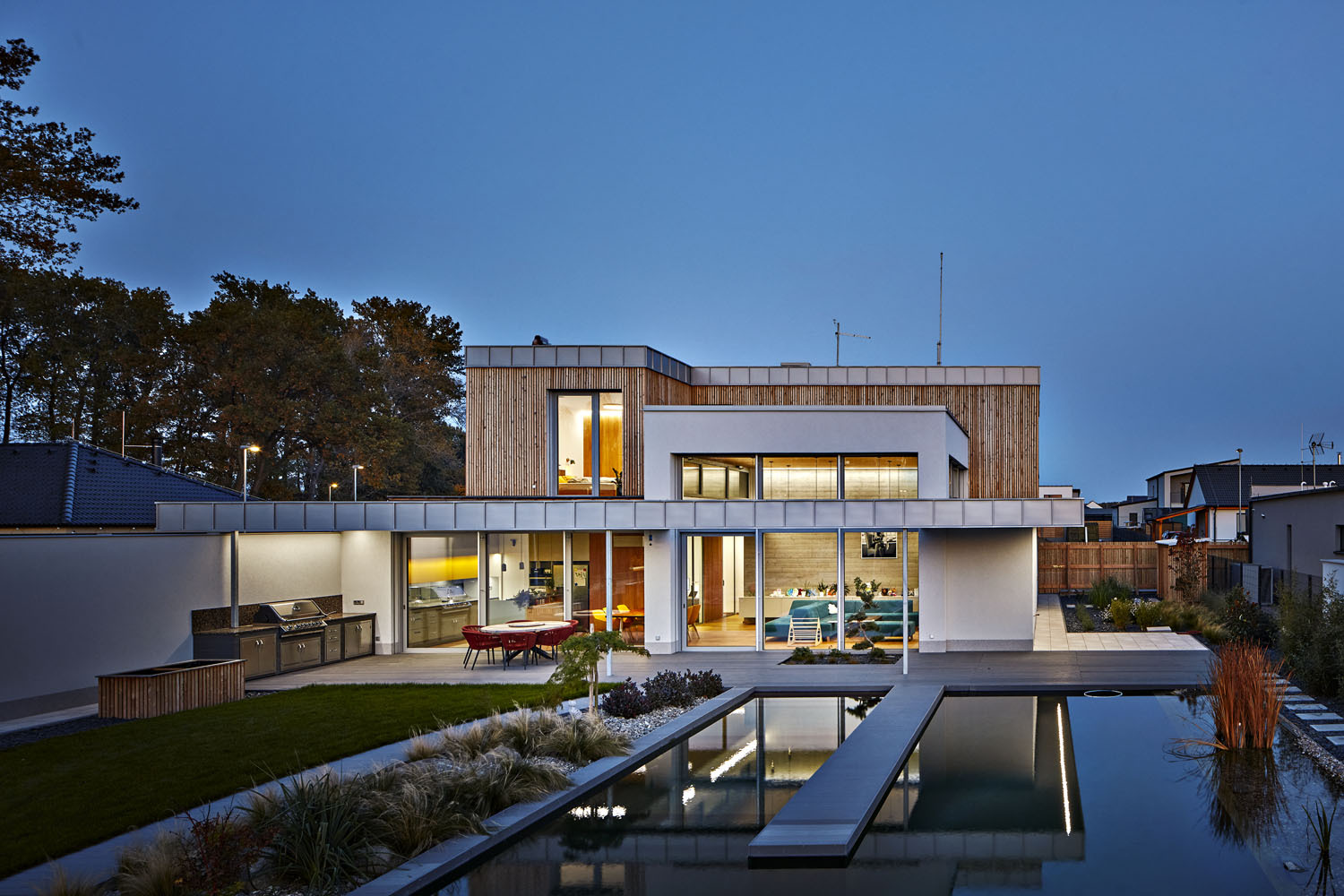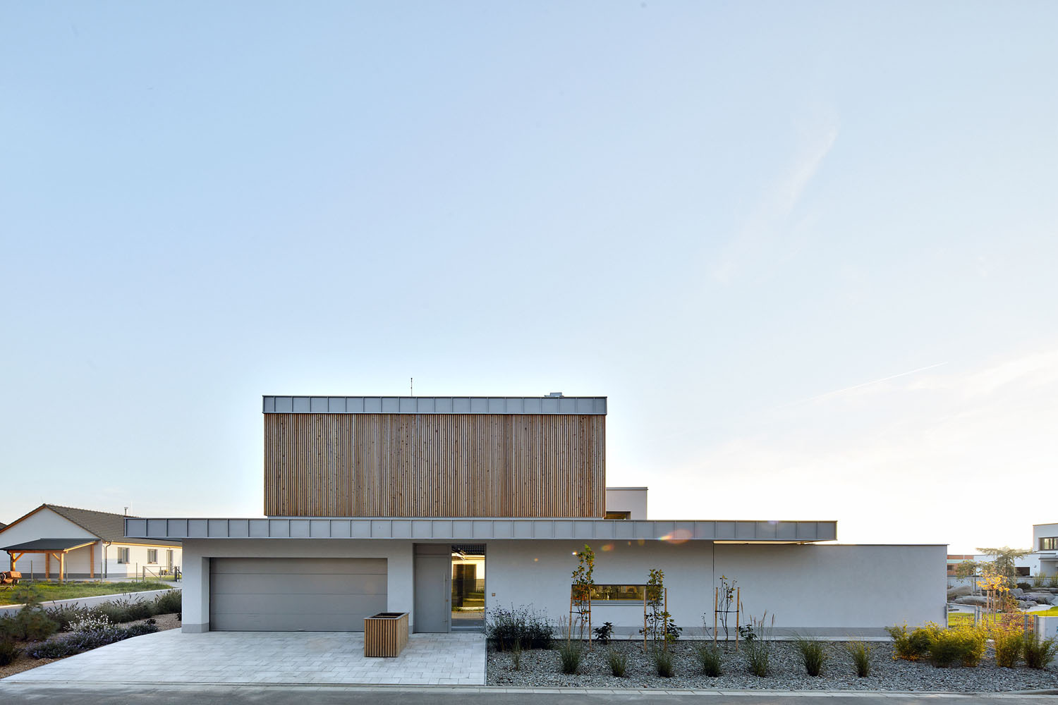 Novostavba na pardubickém předměstí se do zahrady otevírá mnoha prosklenými plochami na několika hmotách, zatímco směrem do ulice zůstává jeho pojetí podstatně střídmější. Interiér se rozvíjí kolem impozantní betonové stěny.