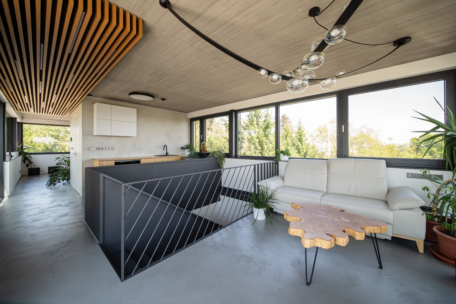 „Majitelka hraje na klavír a přála si pro něj reprezentativní umístění. Jeho nastěhování se ukázalo jako tvrdý oříšek. Statik nám musel posvětit, že schodiště těžký hudební nástroj unese.Přidanou hodnotou nemovitosti jsou bezesporu výhledy, s nimiž návrh počítal a výborně pracuje. Velkoformátová okna horního ateliéru otevírají nejenom panoramatické výhledy, ale také přímý vstup na pobytovou zelenou terasou.