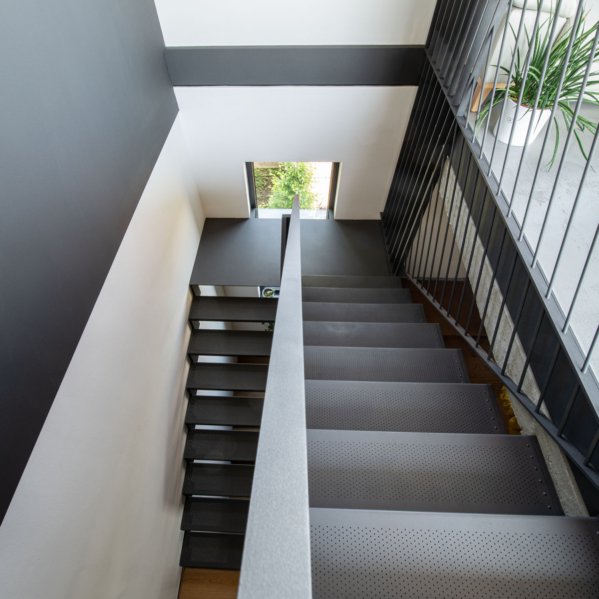 Ústředním motivem se stalo schodiště. Podle autorů pomyslně prorůstá domem jako strom. Jak stoupá, zbavuje se těžší hmoty a opticky se tím odlehčuje. Začíná jako plnostěnné obložené dřevěnými nášlapy a přechází ve schody z perforovaného ohýbaného plechu, které končí ve střešním ateliéru. Konstrukci schodiště drží vnitřní plnostěnné zábradlí se zapuštěným osvětlením. Technické jádro je ukryté v betonové stěně naproti schodišti. Materiálově navazuje na stropy z pohledového betonu. Šedý materiál spolu s tmavým kovem a cotto odstínem cihel dodávají domu nevšední image.