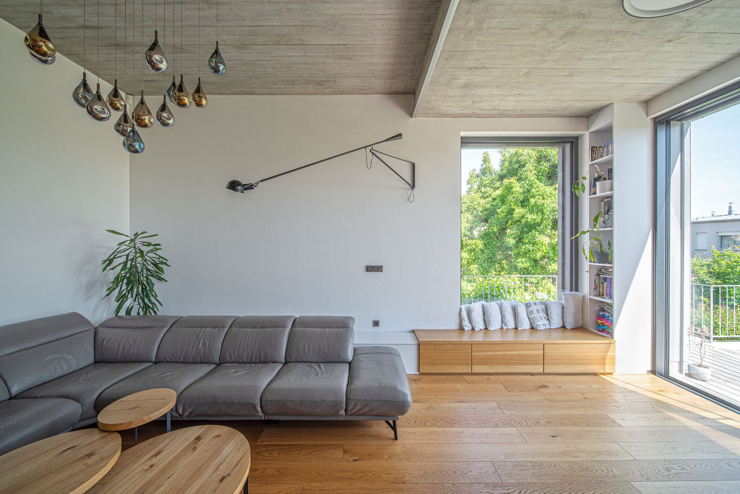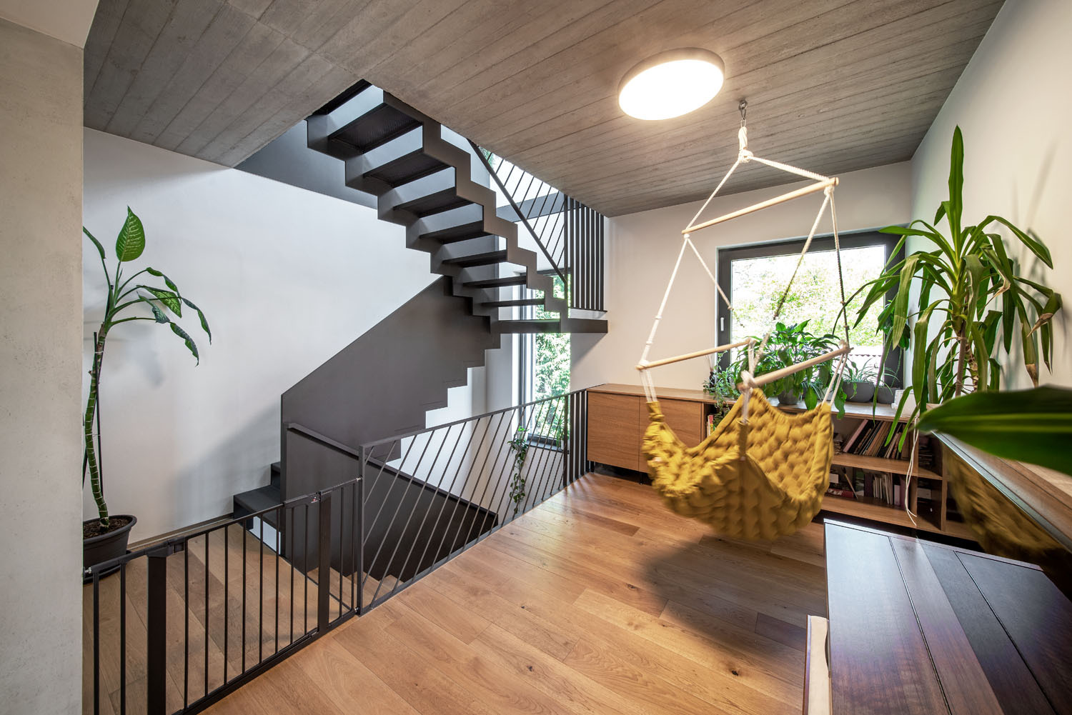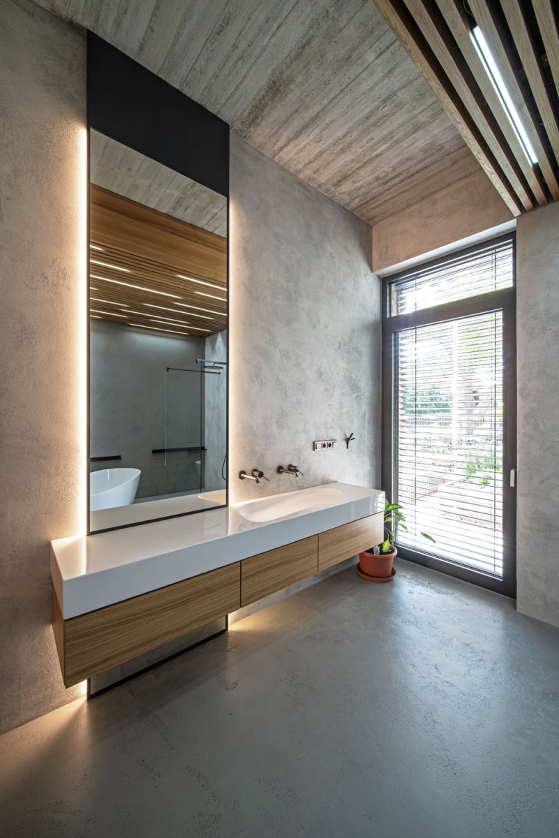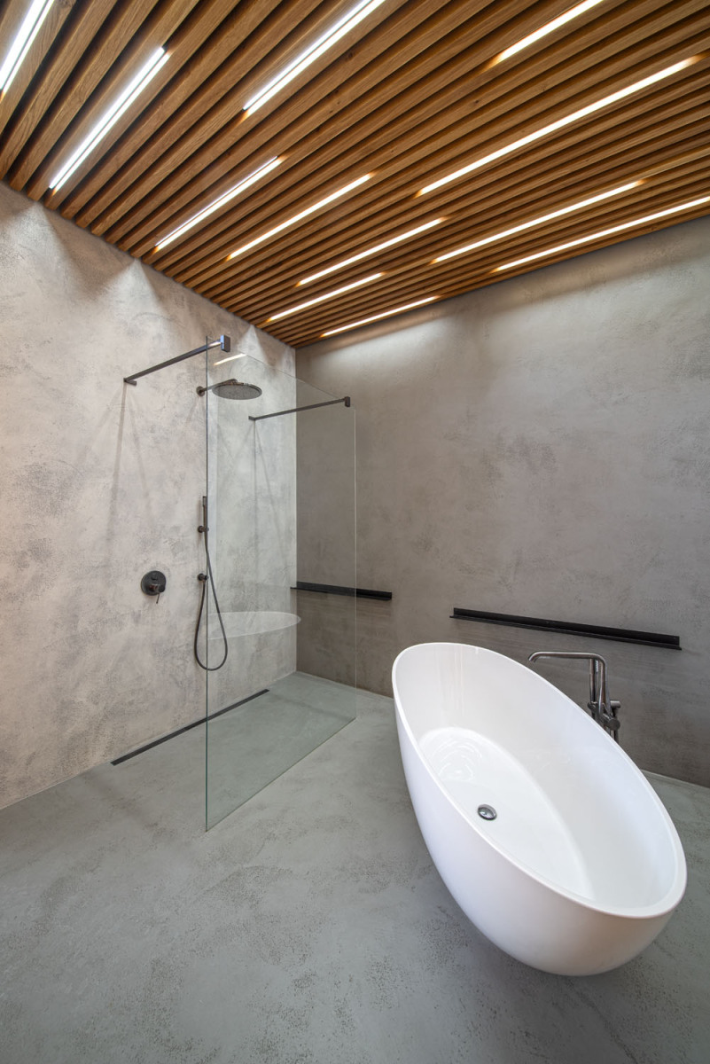 Ateliér funguje jako pracovna, hostinský pokoj, nebo přijdou-li návštěvy, jako prostor pro oslavy, aniž by se narušil provoz v místnostech pro bydlení. Děti si mohou hrát v obýváku a mezitím na horní terase probíhá kupříkladu setkání dospělých,“ popisuje architekt Ondřej Žák. Členové rodiny si můžou doma v klidu zasportovat, aniž by v některé pokoji překážel třeba rotoped. Moderně vybavená tělocvična má i vlastní sociální zázemí.