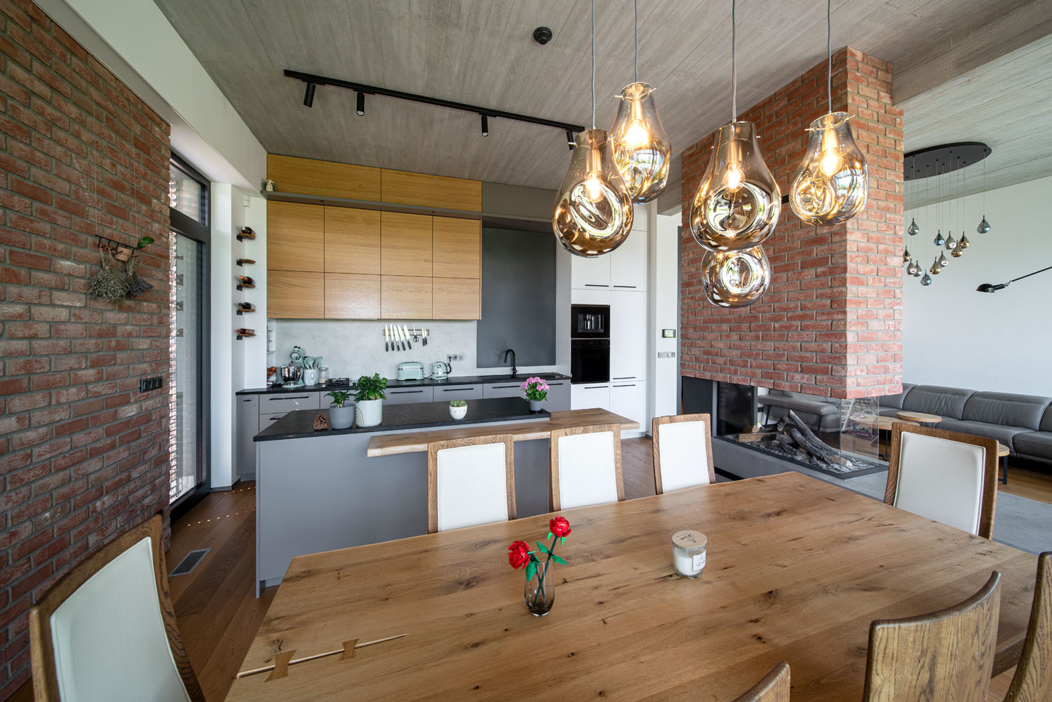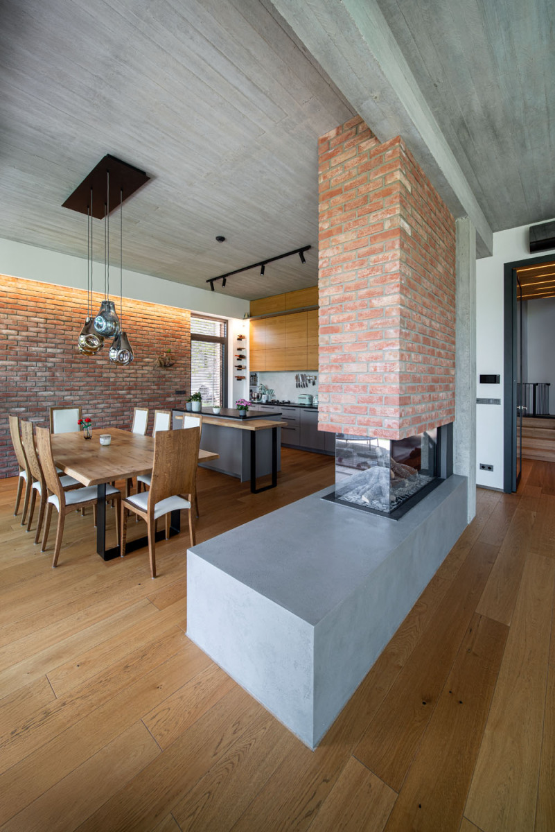 Interiér domu není od exteriéru odtržený, veškerá řešení i materiály zůstaly spolu přirozeně propojené. Díky tomu objekt působí celistvě a jednotně. Cihelný obklad z fasády pokračuje dovnitř a propisuje se do stylu obývacího pokoje. Funguje v něm jako výrazný estetický prvek a akcent spolu s centrálně umístěným krbovým tělesem. V domě, v němž architekti nechali prostor pohledovému betonu, plochám betonové stěrky či tmavému kovu (a majitelé se toho nebáli), přebírá roli hřejivého útulného prvku masivní dřevo na podlaze či v podobě originálních podhledů.
