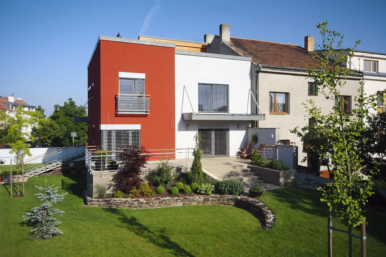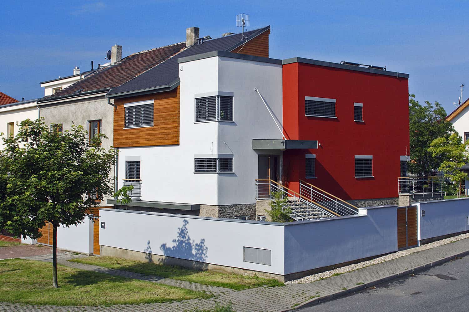Dům moderního tvaru originálním způsobem zakončuje nesourodou řadovou zástavbu postavenou v různých dekádách minulého století. Málokdo by uhodl, že fasáda s odvážnými barvami ukrývá montovanou dřevostavbu.