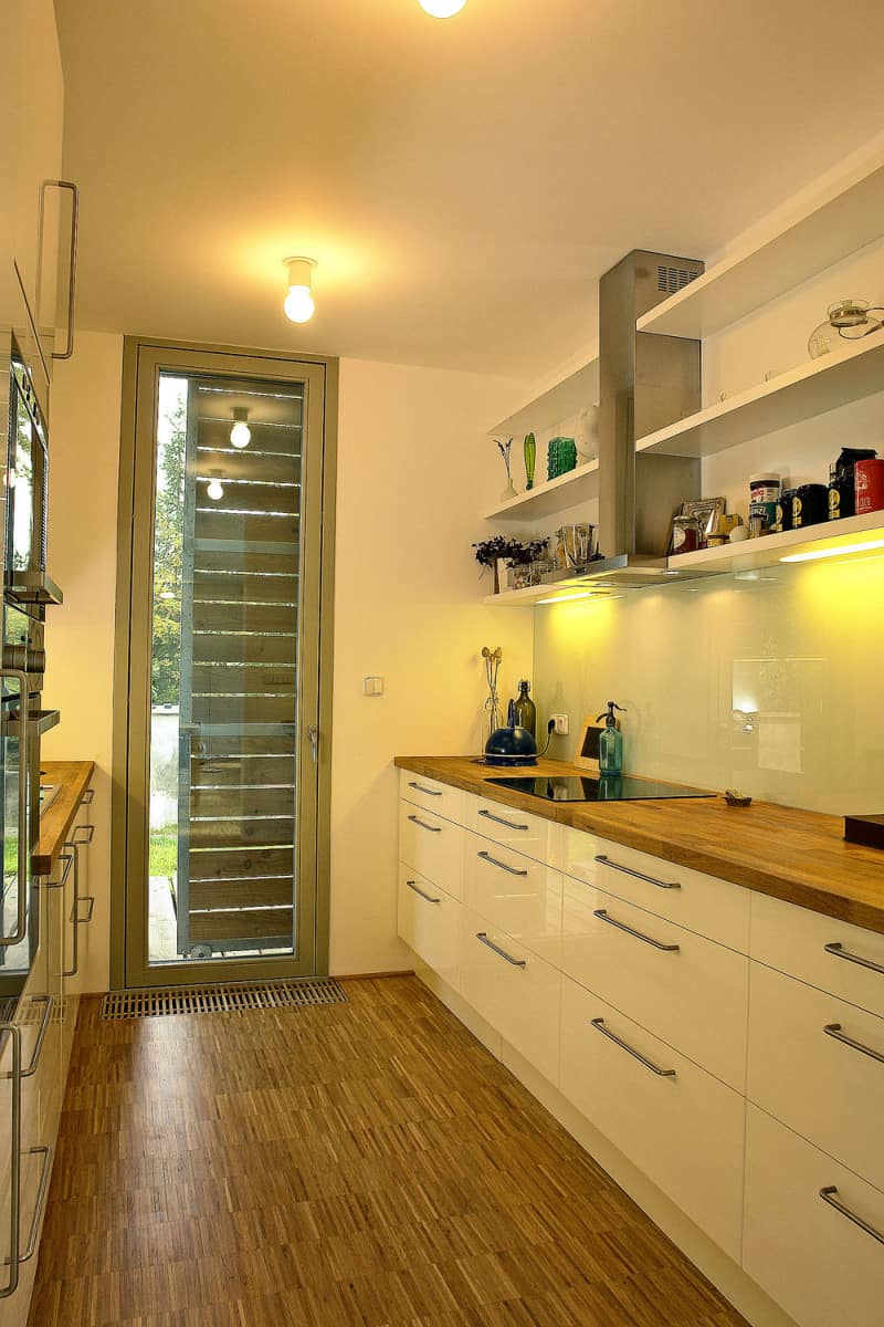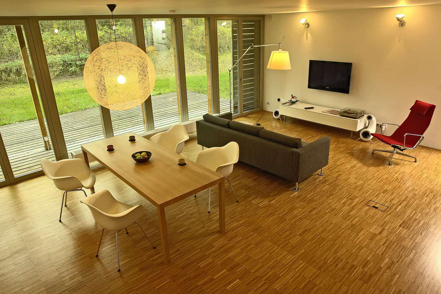 Majitelé měli od počátku jasno ve formě a stylu stavby. Chtěli kvalitní funkcionalistický dům, minimalistické a přímočaré zpracování bez laciné okázalosti, zbytečností a příkras. A výsledek takový opravdu je. Architektonický koncept domu, který je dílem architektů ze studia Olgoj Chorchoj, vychází z tvaru a orientace pozemku. Obdélníkové stavba směřuje podélnou osou kolmo k ulici, obytné prostory jsou orientovány k jihu do zahrady a k lesu, severní stěna domu je kompaktní a uzavřená.