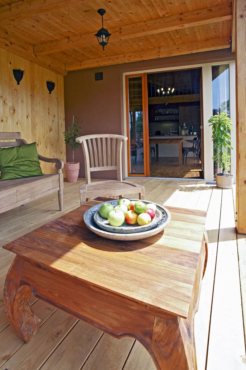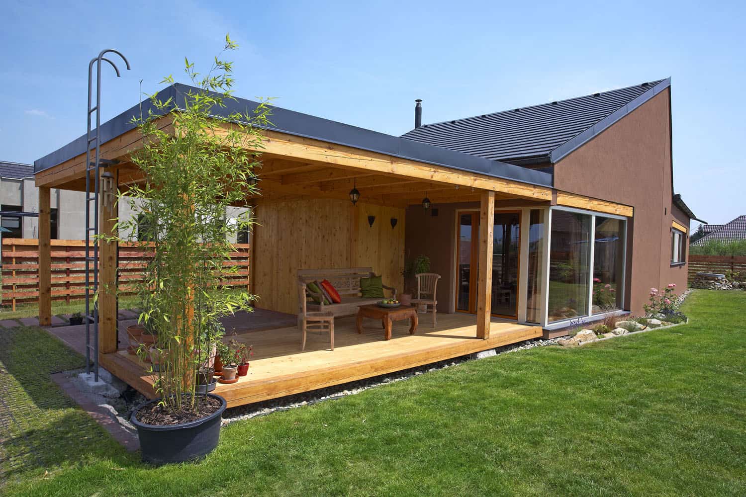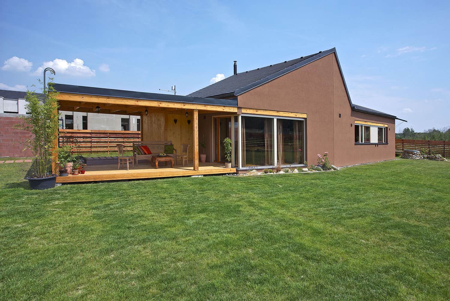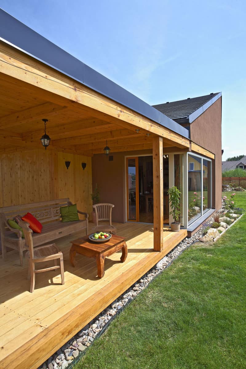 Úsporný dům, postavený na východ od Prahy, využívá moderní technologie i tradiční východní učení. Silueta prozrazuje inspiraci starým japonským uměním skládání papíru, pod pláštěm najdeme prvky pramenící z filozofie feng-šuej i výrobky z teakového dřeva z Indonésie.