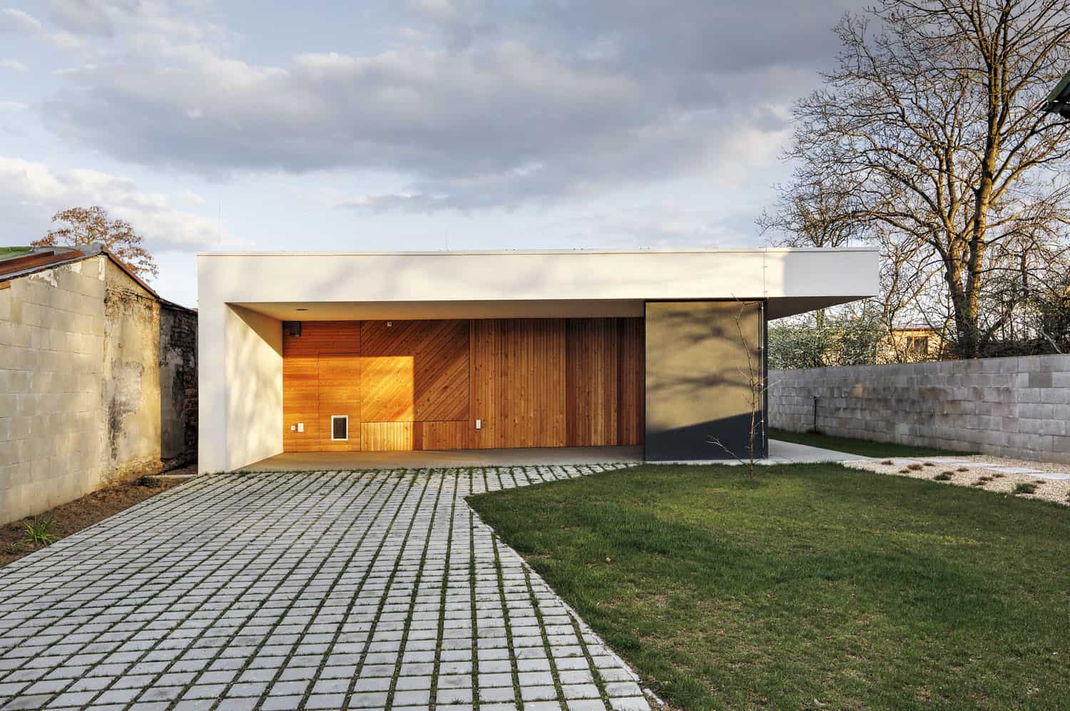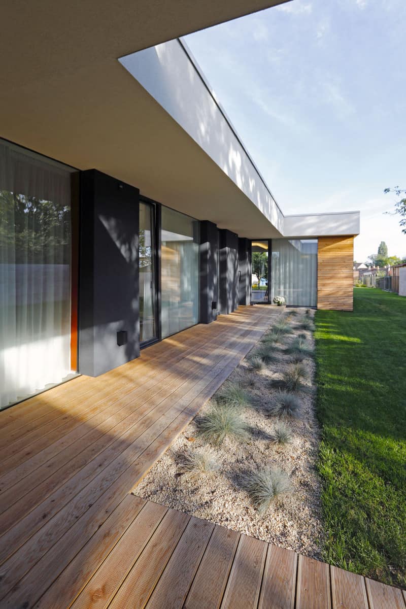 Architekti ateliéru Kunc zvažovali několik variant, aby posléze navrhli zajímavou kompaktní jednopodlažní dřevostavbu v pasivním standardu s atriem (či spíše poloatriem) a zahradou. S majitelkou se shodli na tom, že dům by měl mít „velké srdce“, což znamená hlavní místnost, která rodinu spojuje. V tomto případě je to obytná část, jež se otevírá jak do atria, tak do samotné zahrady. V kombinaci s dobře volenými interiérovými barvami a velkými prosklenými plochami máte pocit, že bydlíte přímo v zahradě.