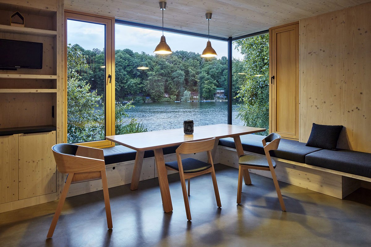 V každém koutě domu se skrývají nenápadné úložné prostory, každá věc má své místo stejně jako v kajutě lodi. Interiér domu je propojený, zároveň ale podkroví poskytuje dostatek soukromí. Interiér obklopený smrkovým dřevem nabízí útulné útočiště a velké prosklené plochy pak dechberoucí výhled na vodní hladinu.
