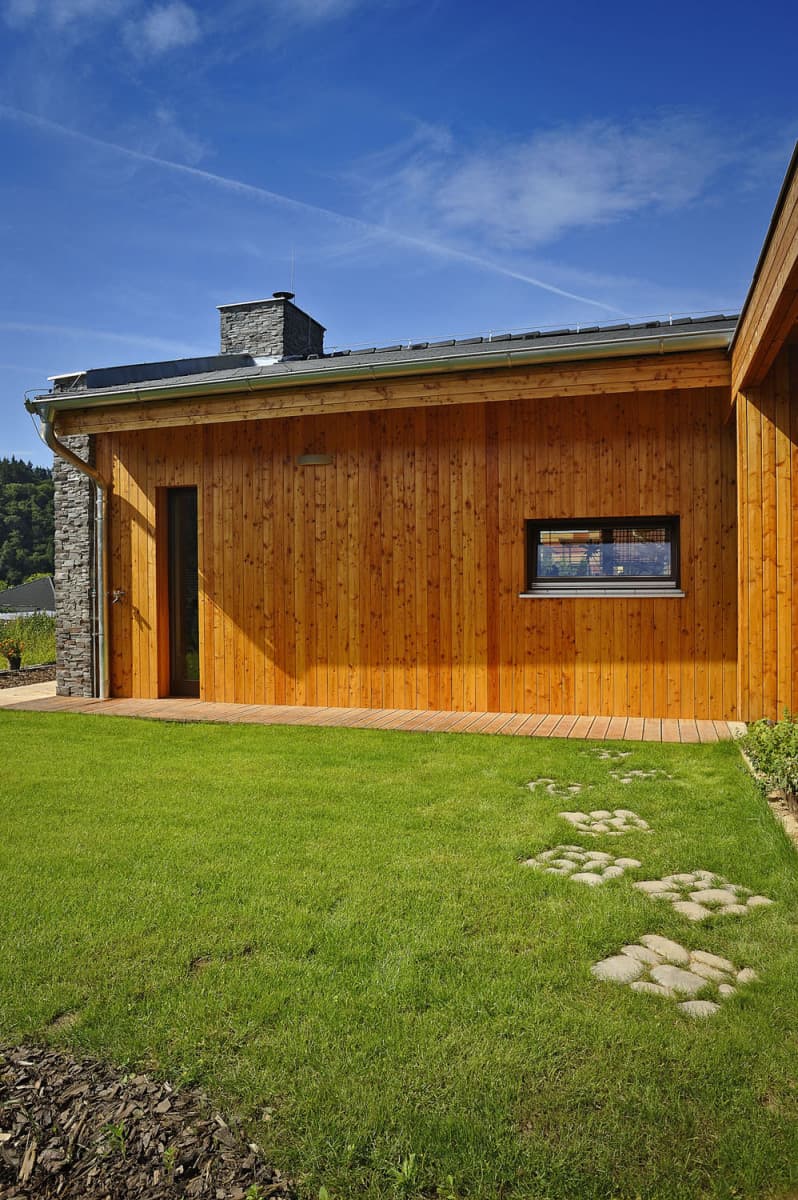 Dům v malé obci v údolí Sázavy působí díky svému plášti ze dřeva a kamene již na první pohled příjemně. A velmi příjemné je i jeho vnitřní klima.