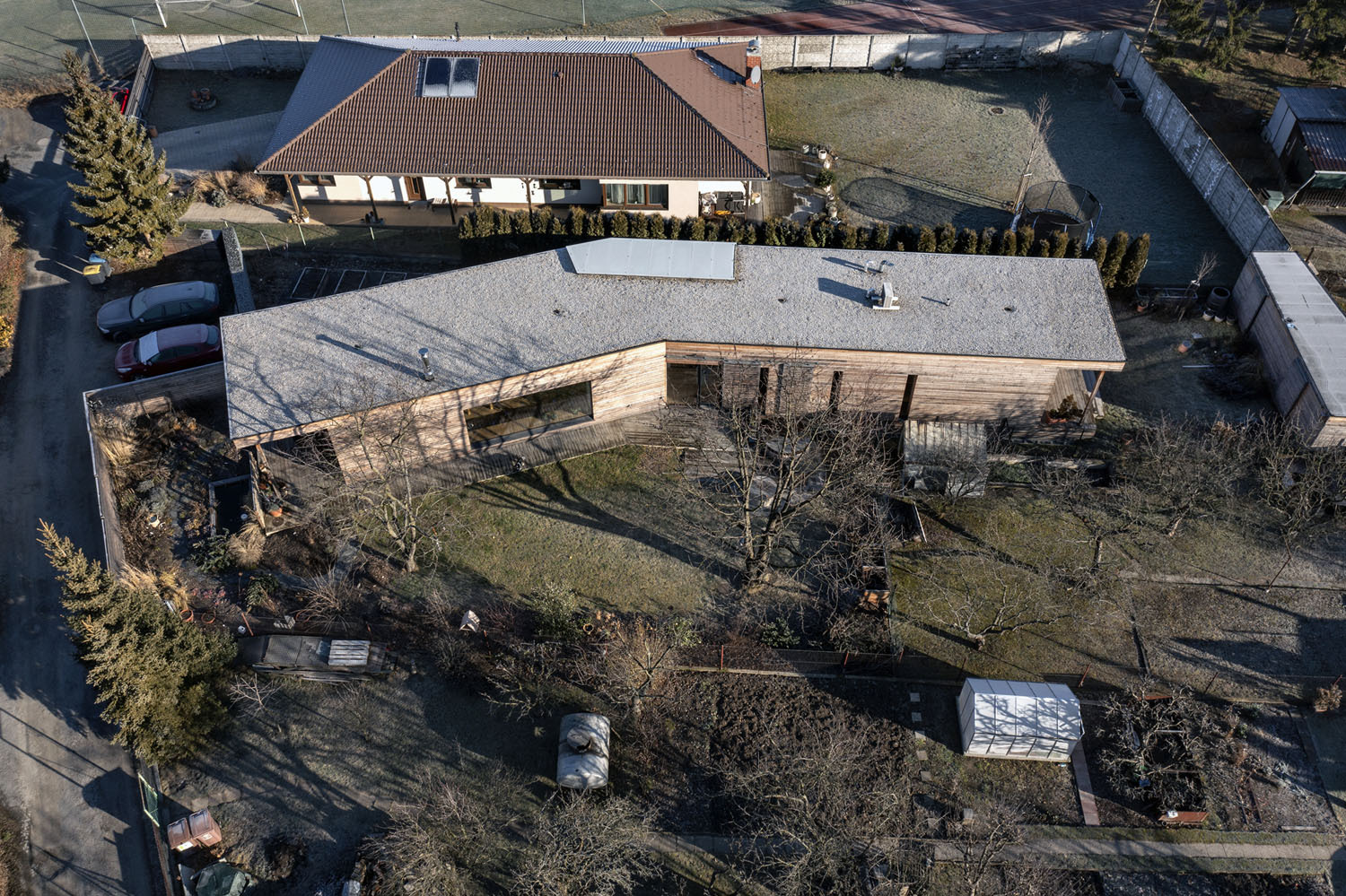 Následuje vrstva tepelné izolace z pěnového polystyrenu a střešní krytina přitížená kačírkem. Fasádu tvoří vodorovně kladená hoblovaná modřínová prkna, u teras jsou fasády obloženy laťováním drobnějšího měřítka a detailu. Rámy oken a dveří jsou dřevohliníkové, v oknech jsou trojskla. Hezkým výtvarným prvkem je posuvná okenice u terasy obrácené k jihu.