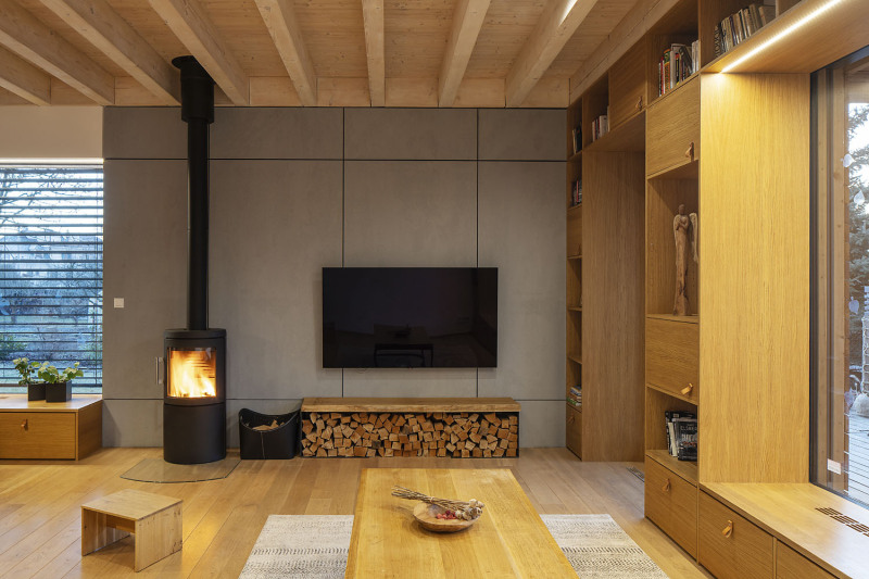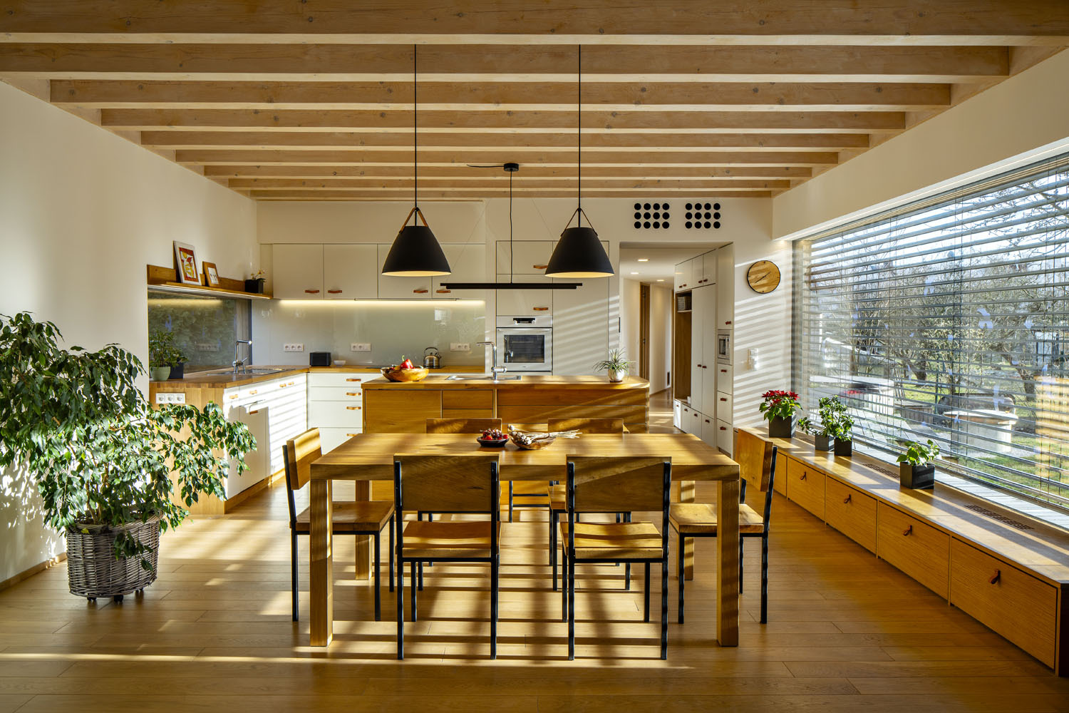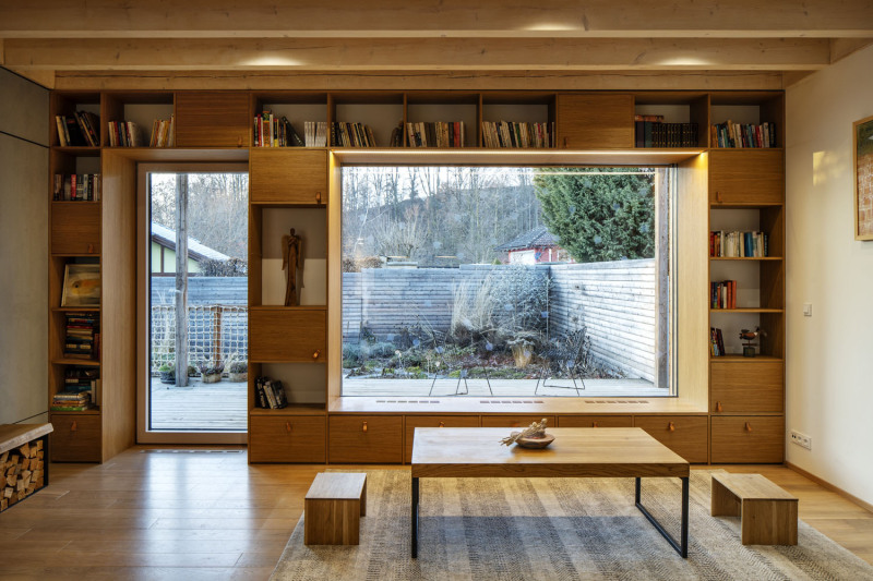 V podélném prostoru velké místnosti s trámovým stropem se nachází kuchyně s výhledem na přístupovou pěšinu a jídelna s širokým bočním oknem do sadu. V obývacím koutě s knihovnou je výstup na krytou terasu s mokřadním biotopem. Interiéry jsou společným dílem architektů a klientů, velké skleněné a světlé plochy doplňuje dřevo na podlaze i vestavěném nábytku. Police a skříně prostorem volně plynou, nabízejí různé niky a sedací parapety; velmi dobře je vyřešena šatna v prosvětlené chodbě u ložnic, v krásných světlých skříních je spousta úložného prostoru.