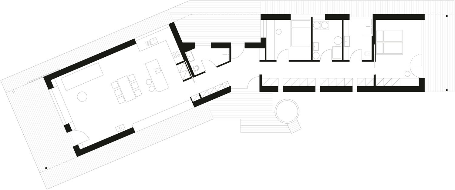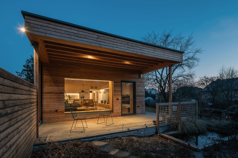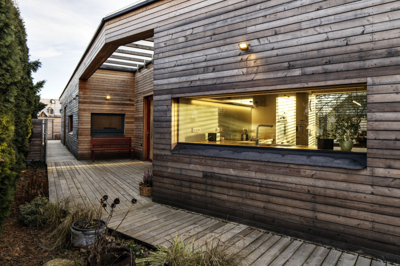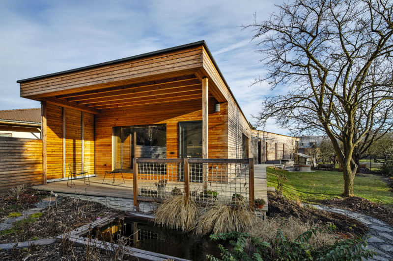 Rodinný dům na Hané měl docela komplikované zadání: parcela nepravidelného tvaru se v jednom místě zužuje na pouhých deset metrů, u příjezdové cesty má souseda hned za plotem. Jak už je v ateliéru MOLO architekti zvykem, vznikla dřevostavba s velkými okny a tentokrát i několika terasami, které pozemek člení – je tu divoká zahrada, sad, klidné zákoutí pro odpočinek i zeleninové záhonky.