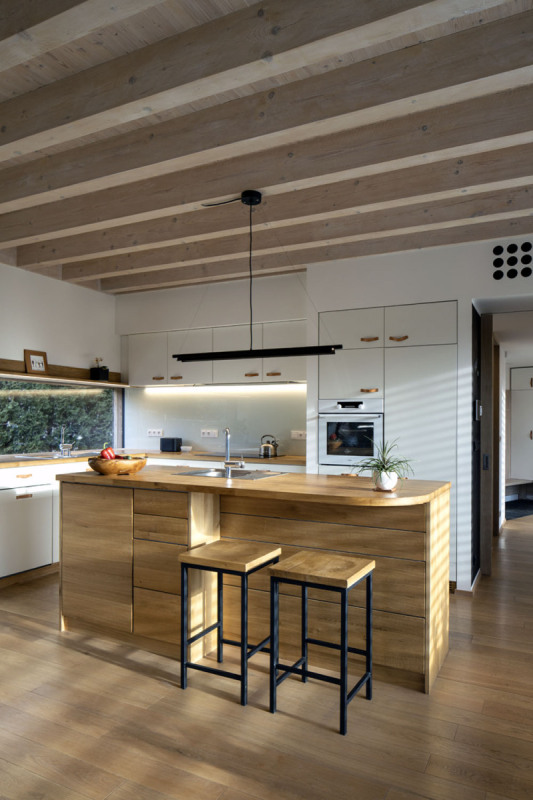 Stavba je bezbariérová, podlaha je ve všech místnostech v jedné úrovni, navazují na ni terasy. Podlahy jsou z dřevěných trámů 40 × 240 mm. V celé ploše jsou provětrávané, zespodu byly zaklopeny difuzně otevřenými deskami, z vrchu je skladba podlahy zaklopena OSB deskou s funkcí parozábrany. Stěny domu jsou z dřevěných sloupků o průřezu 40 × 160 mm, vyplněny byly minerální vatou. Nosná konstrukce střechy je z trámů 240 × 40 mm, na kterých je záklop z OSB desek a asfaltová pojistná hydroizolace.