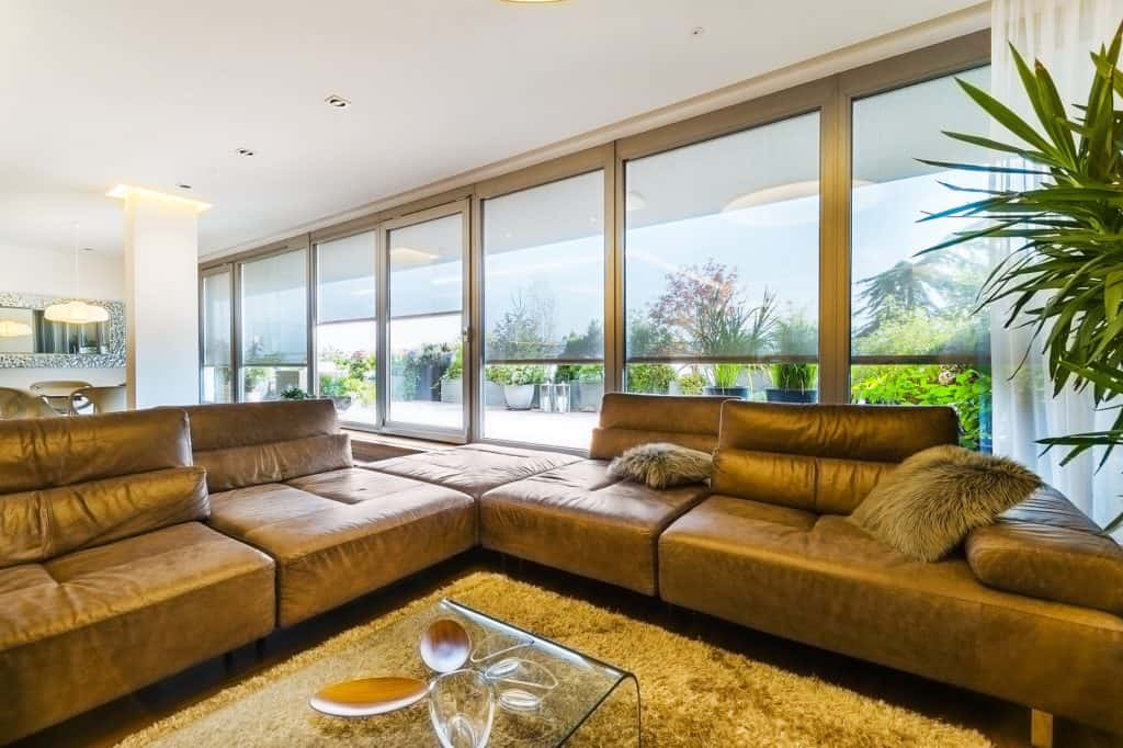 Velkoryse pojatý interiér s velkoformátovými prosklenými plochami a screenovými clonami. Ty se umísťují na venkovní straně okna nebo prosklené stěny (MINIROL)