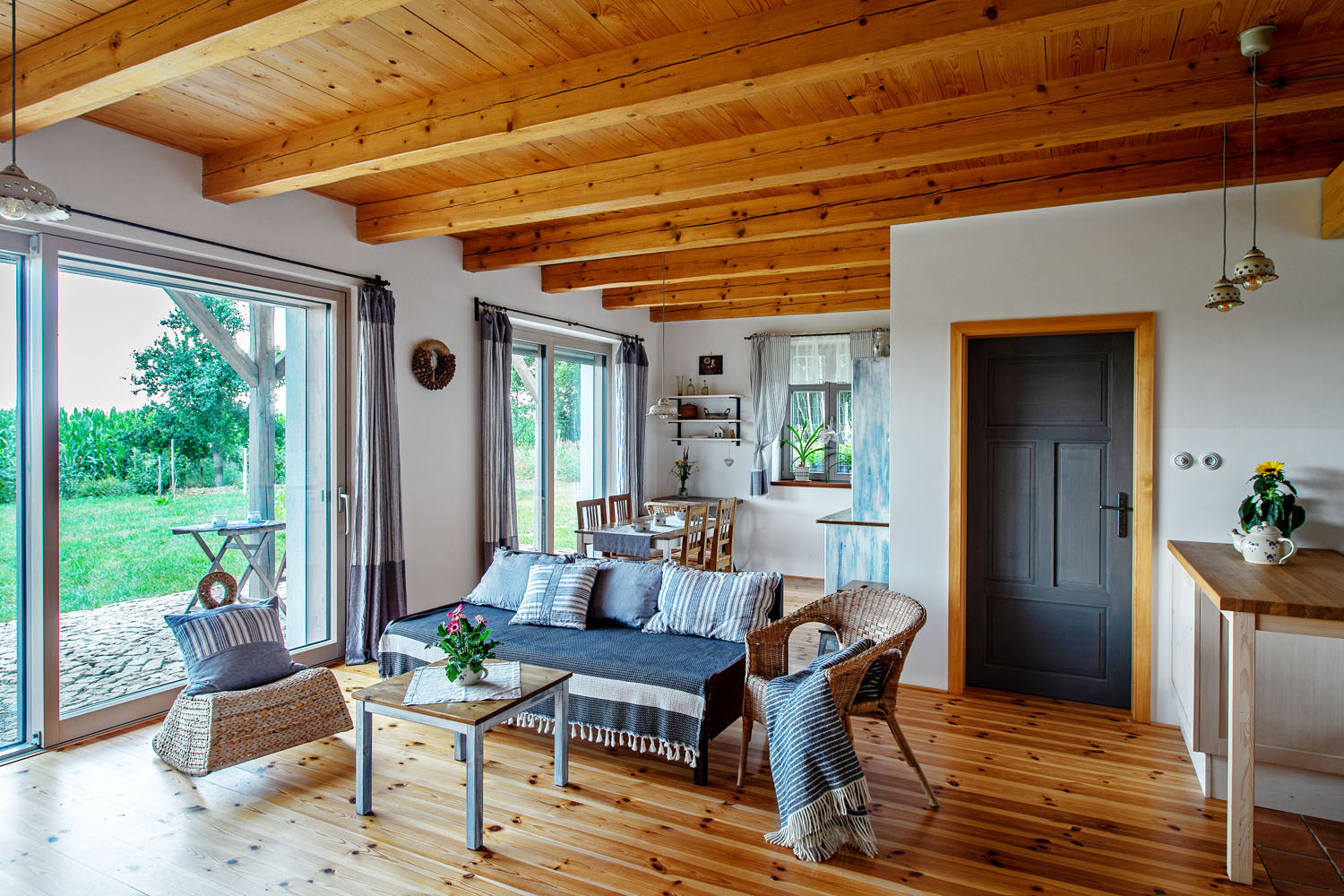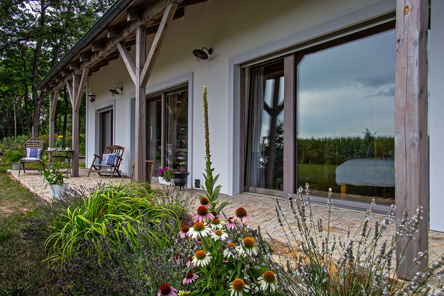 Designérka Zora Stupňánková a její partner Stanislav Baťka hledali starou chalupu k rekonstrukci velmi dlouho a v ubíhajícím čase přemýšleli stále častěji o tom, že si takový dům postaví. „Typový dům nás asi vůbec nenapadl,“ vzpomíná Zorka. „Oslovili jsme pana architekta Mojmíra Hudce a nastínili mu své představy. Logicky nás dovedl k určitým úpravám a nakonec k pasivnímu domu. Proti původní představě jsme zvětšili okna na jih, přidali izolaci a rekuperaci. A také jsme určitě věděli, že v chalupě bude dřevěný strop a na podlahách půdovky nebo dřevo.“