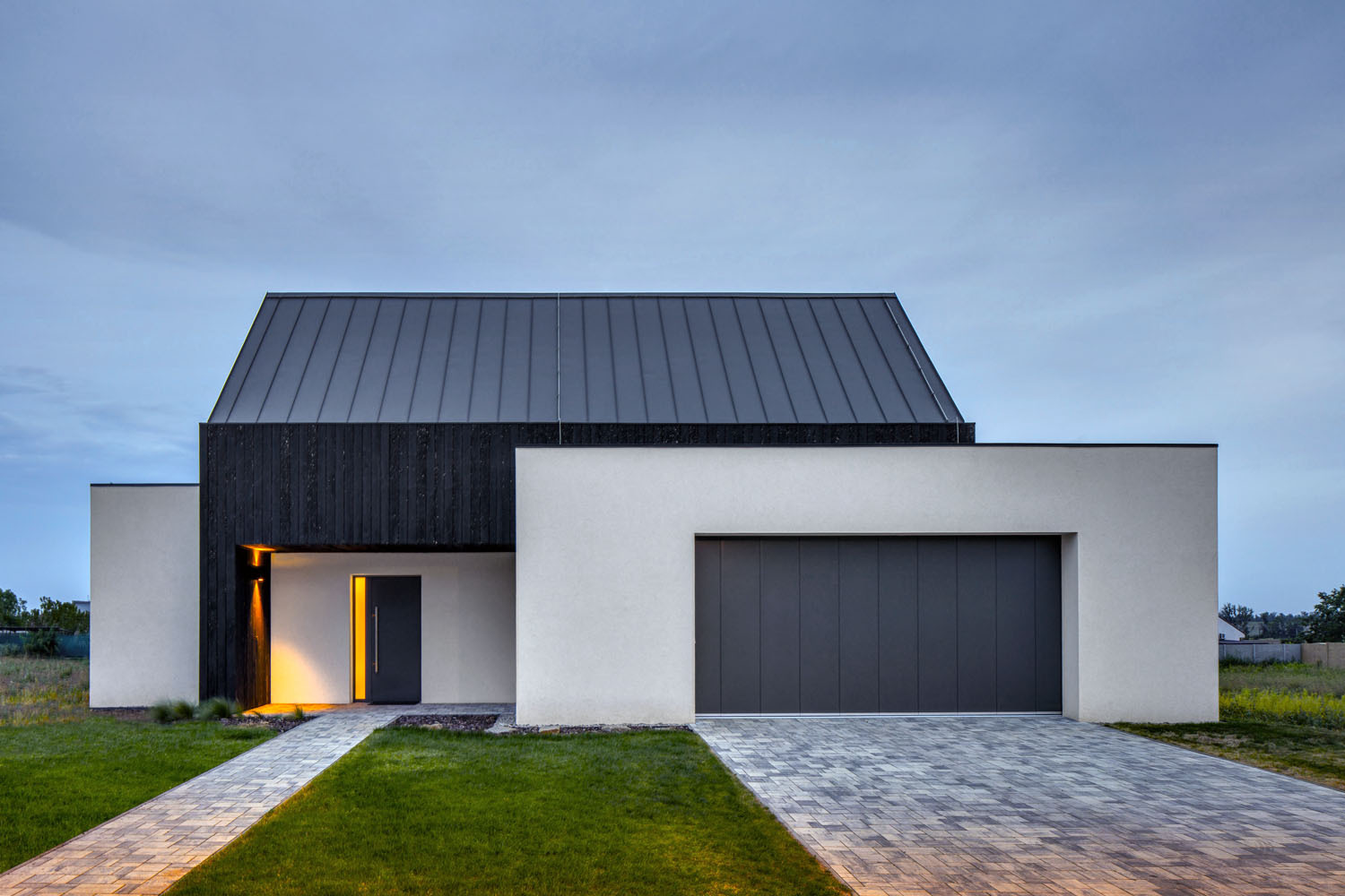 Plochá i sedlová střecha, dřevo a omítka, černá i bílá fasáda – kontrast i harmonie. V malé obci na jižní Moravě vznikl rodinný dům, který originálním způsobem respektuje ducha lokality, a zároveň přináší současné architektonické hodnoty a moderní komfort.