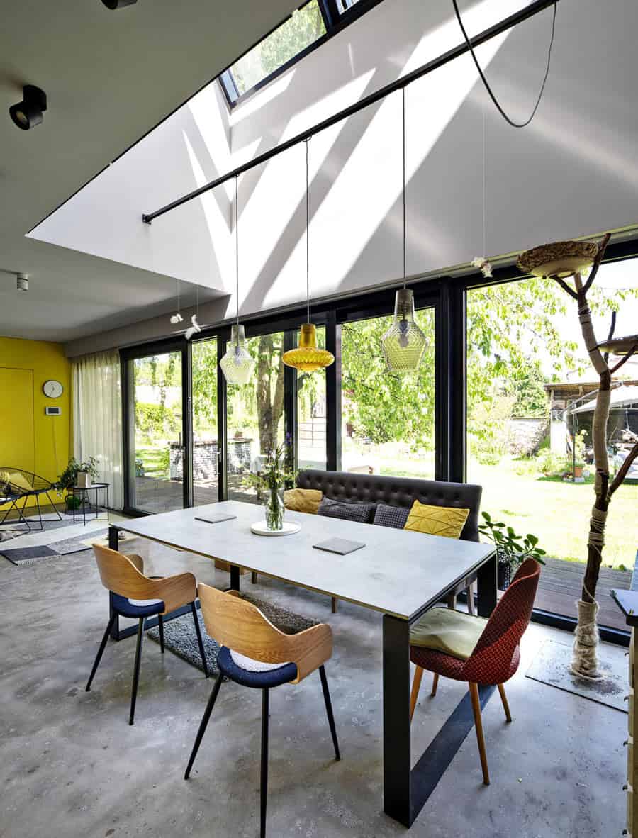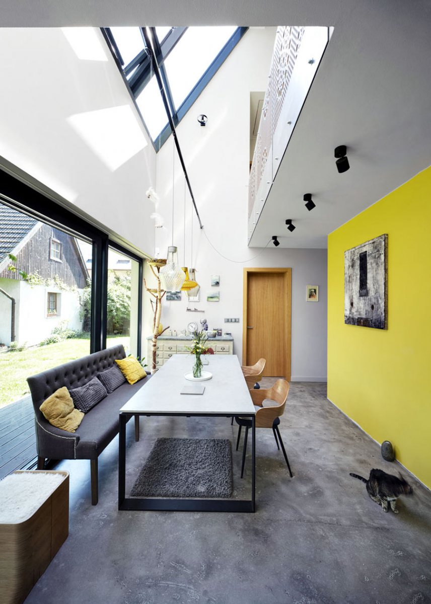Dům stojí uprostřed malebné vesnice a pak ještě uprostřed zahrady se starou kamennou zdí. Byl proto navržen tak, aby zachoval kontext místa a zároveň poskytl prostorově velkorysý koncept. Má ateliérová okna, nad bazénem zelenou střechu. Ale nejzajímavější je u této stavby propojení interiérů – z obytné části vidíte přes halu k bazénu a naopak. Místnostem to dodává půvab a dynamiku.