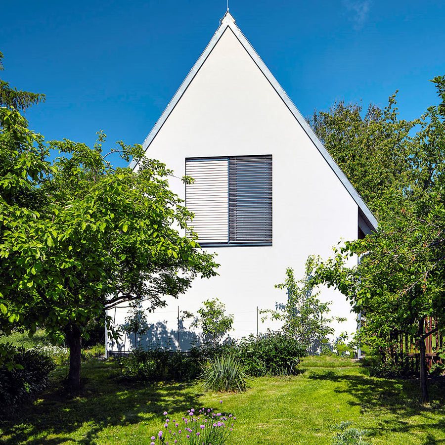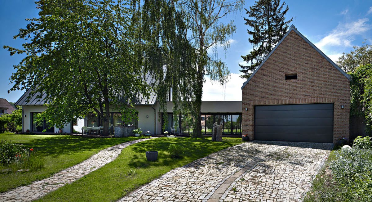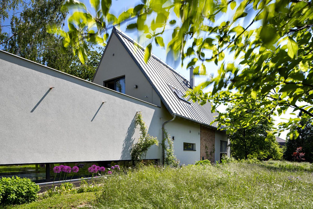 Místo vjezdu do dvora je tu vnitřní bazén, za garáží se skrývá ateliér a hlavní obytný prostor je bohatě prosklený. Na jižní straně okna stíní stará třešeň, která dobře nahradí pergolu nad terasou. Zahrada dům obklopuje ze všech stran – vpředu je pobytová, za domem se skrývá louka.