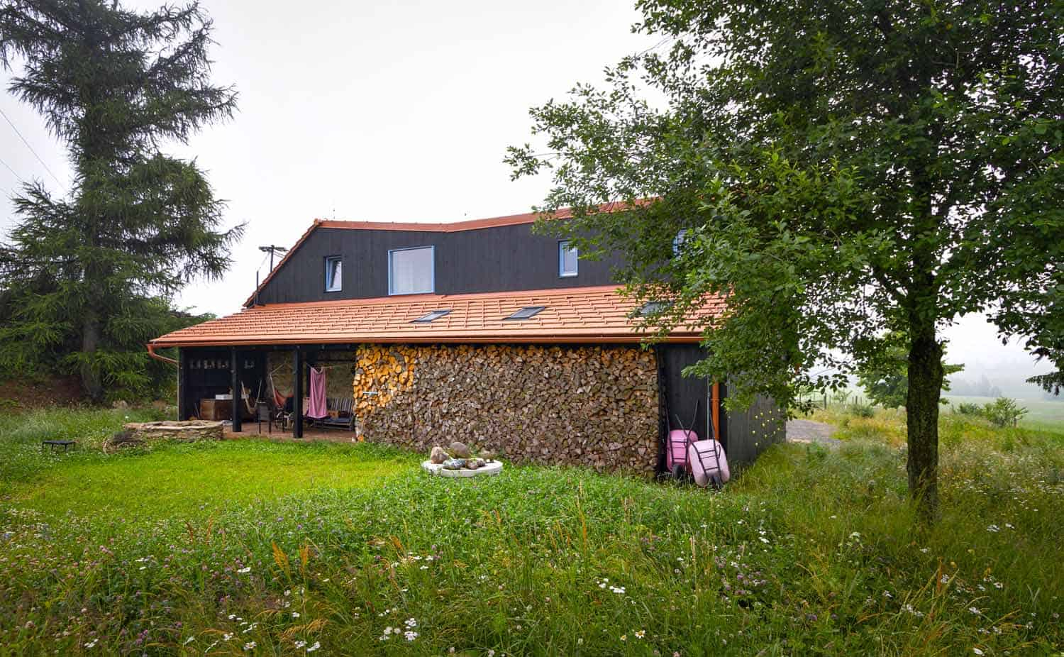 Malá usedlost má půdorys písmene U, uprostřed byly chlévy, vlevo stodola. Vznikl tak polootevřený dvůr, který ji chrání před málokdy ustávajícím větrem. „Původně jsme chtěli dům zachovat, i když jsme věděli, že třeba stodola na tom není úplně dobře. Zprvu to opravdu vypadalo, že ho zachráníme, technicky i staticky byl docela v pořádku. V průběhu stavby se ale ukázalo, že například krov stodoly je ve velmi špatném stavu, krov nad chlévy byl navíc nepoužitelný pro patro s ložnicemi.