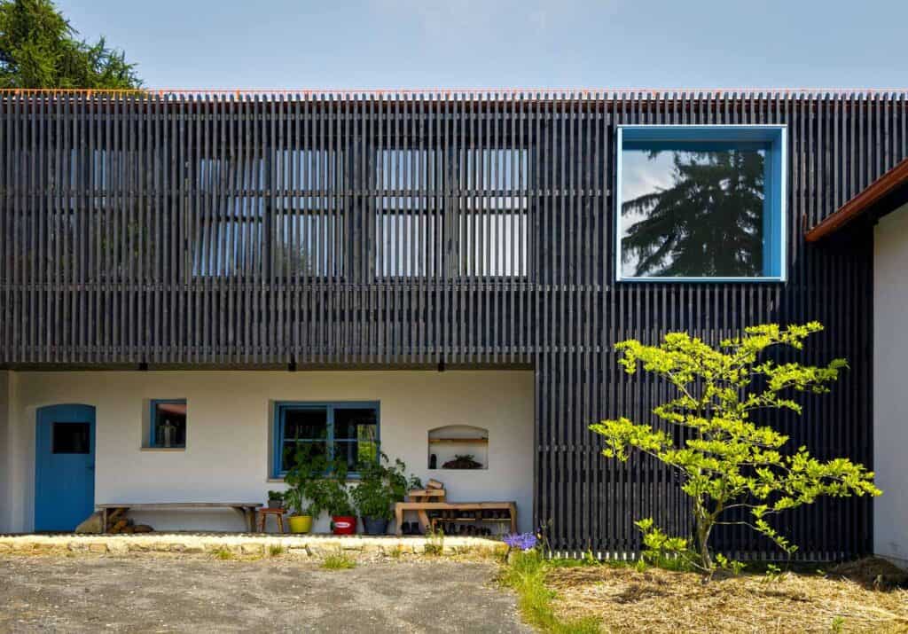 Dvůr před domem se otevírá k západu, ve střední části nad původními chlévy vznikly pod střechou ložnice, které propojuje prosklená chodba. Její okna jsou z velké části zakryta dřevěnými latěmi tak, aby zůstal zachován venkovský charakter stavby. Všechny dřevěné části stavby v exteriéru jsou natřeny černou olejovou lazurou.