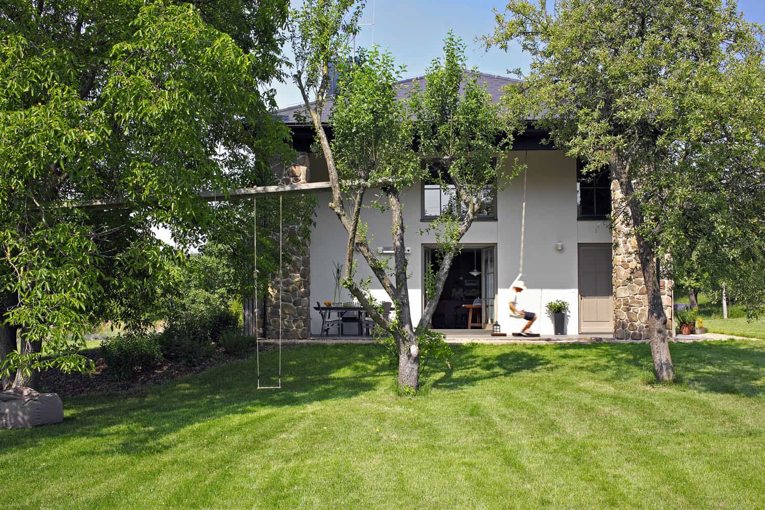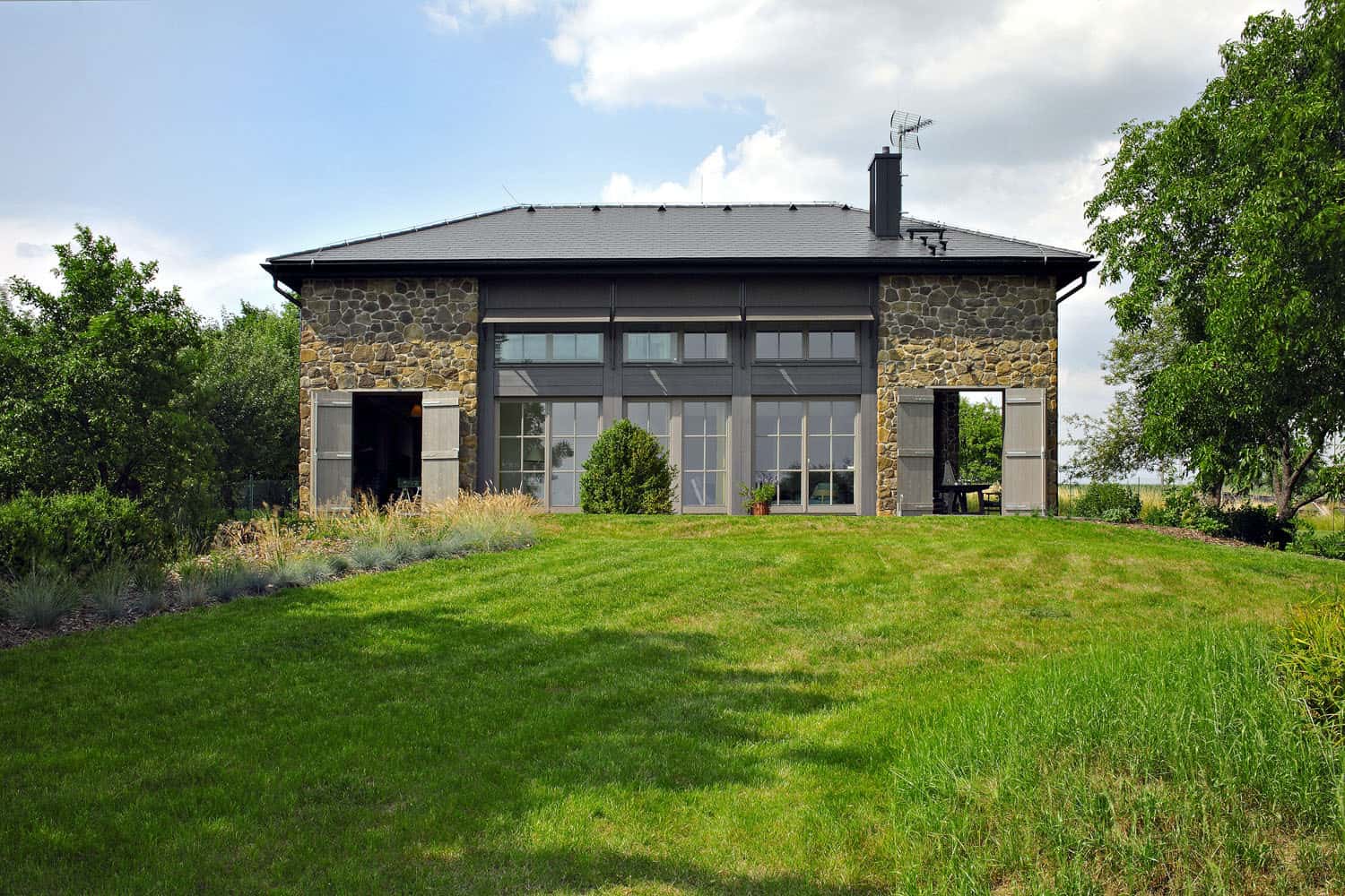 Místo pro stavbu hledali v méně osídlené oblasti v okolí Šumavy a brdských lesů, která je z Prahy dobře dostupná. Volba nakonec padla na obec Lhovice v západních Čechách, v jejímž okolí se nachází několik kulturních památek. Pozemek o rozloze zhruba 6 000 m2 tvoří převážně zatravněná plocha a jablečný sad, z kterého je dokonalý panoramatický výhled na bránu šumavských hor. Zastavěná plocha domu činí 150 m2. Na otázku, jestli se do domu nastěhují časem natrvalo, odpovídá Marta Lukešová, že se uvidí. „Protože ale milujeme proces zrodu nové stavby, myslíme si, že ještě něco postavíme,“ dodává s úsměvem.