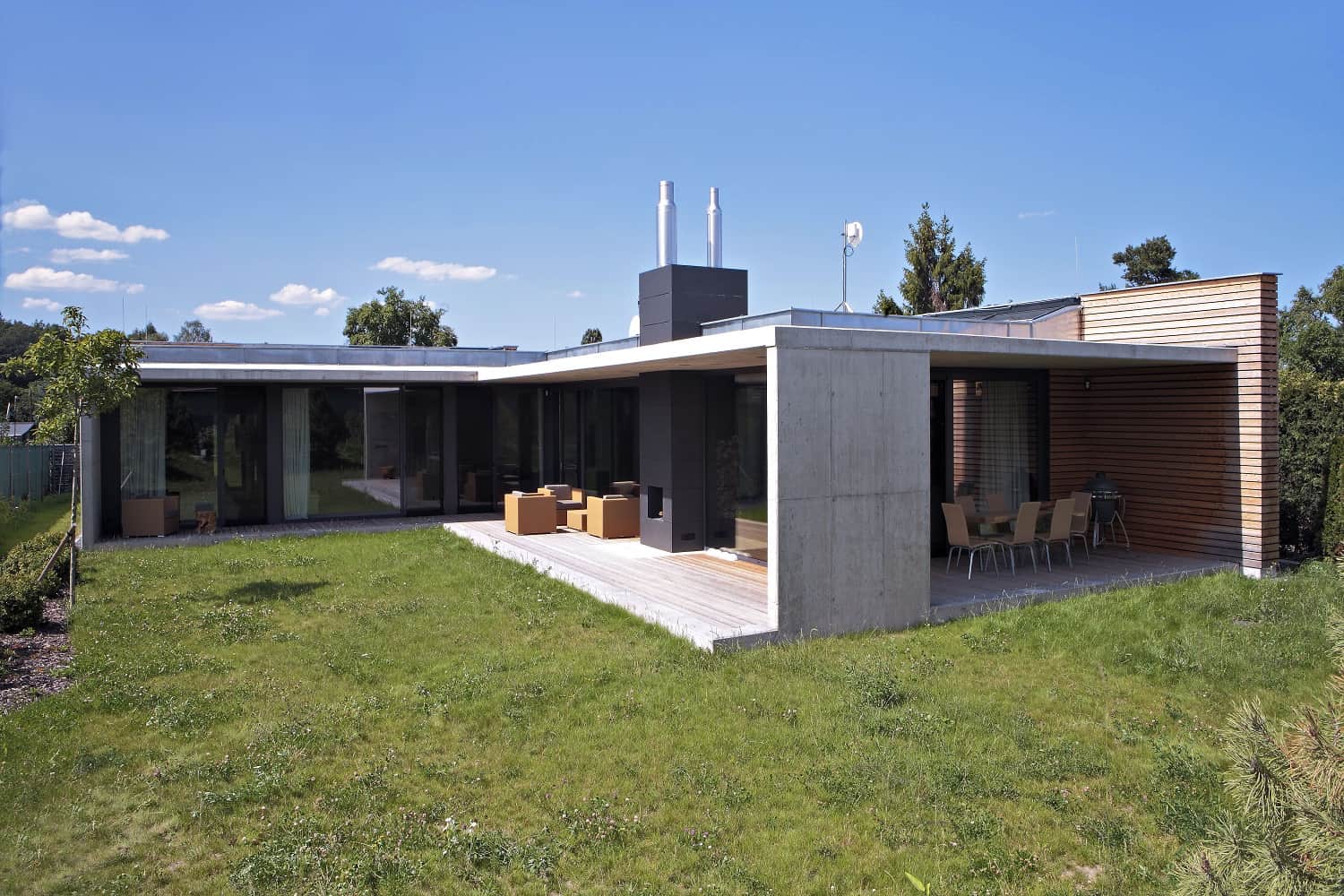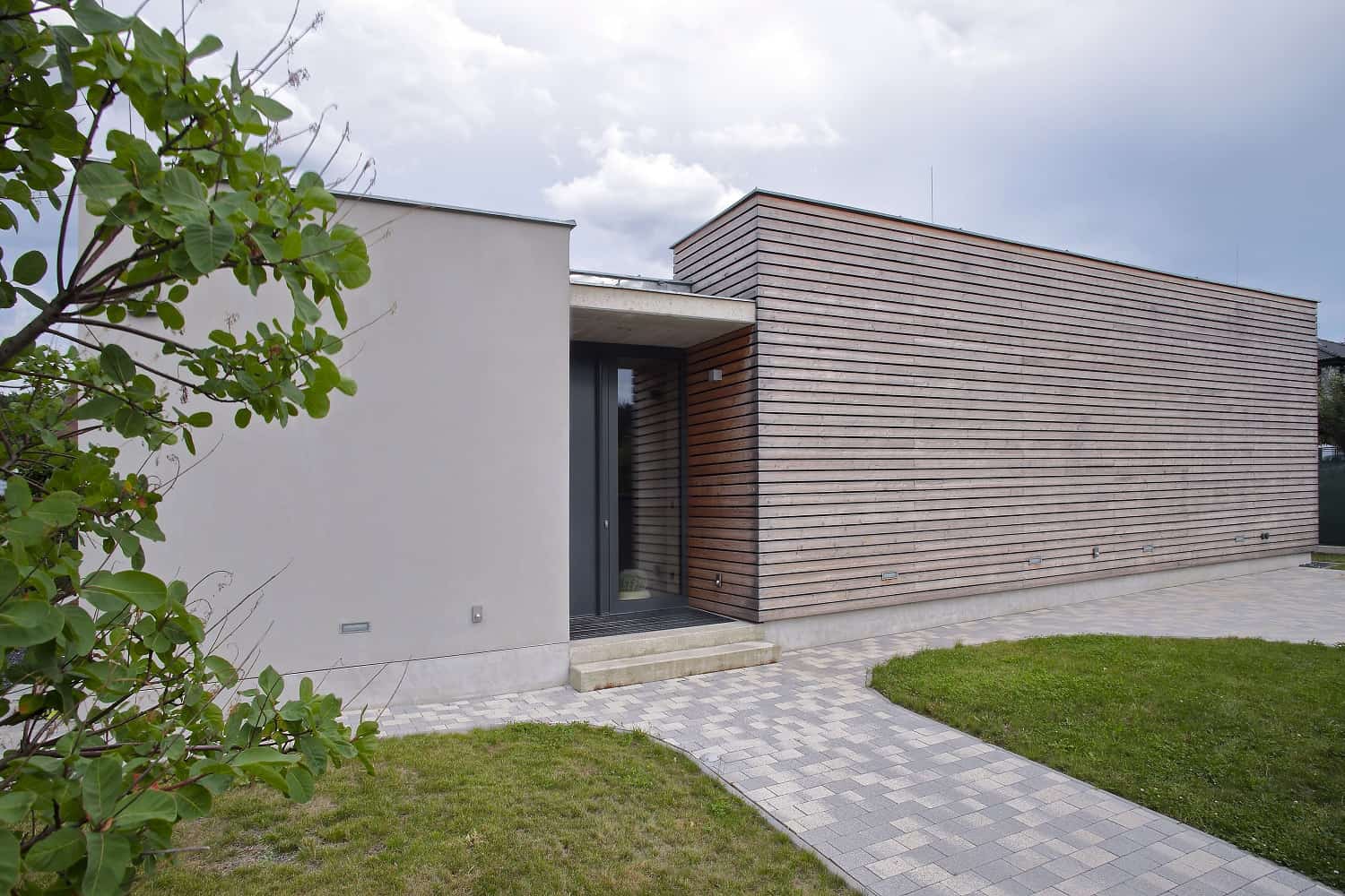 Přízemní stavba striktně využívá menší pozemek nedaleko Prahy – severovýchodní stěna bez otvorů chrání majitele před zvídavými pohledy, vnitřní strana písmene L cele využívá výhody jihozápadní orientace: „Celý dům se otevírá do zahrady terasou a prosklenou plochou pobytových prostorů, zeď ho uzavírá ulici a sousedům. První skici naznačovaly, že se jedná o skořápku, která vytváří soukromí. Minimalistické fasády bez otvorů nechávají vyznít dva základní materiály stavby – dřevo a pohledový beton,“ říká architekt Peter Hričovec, autor projektu.