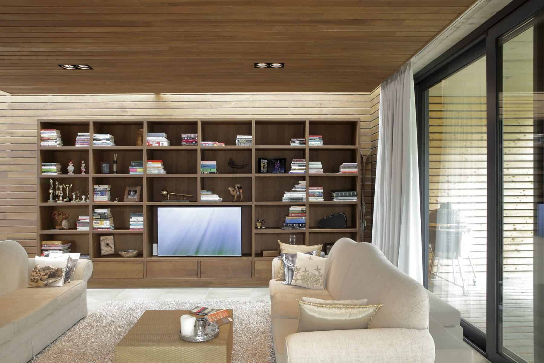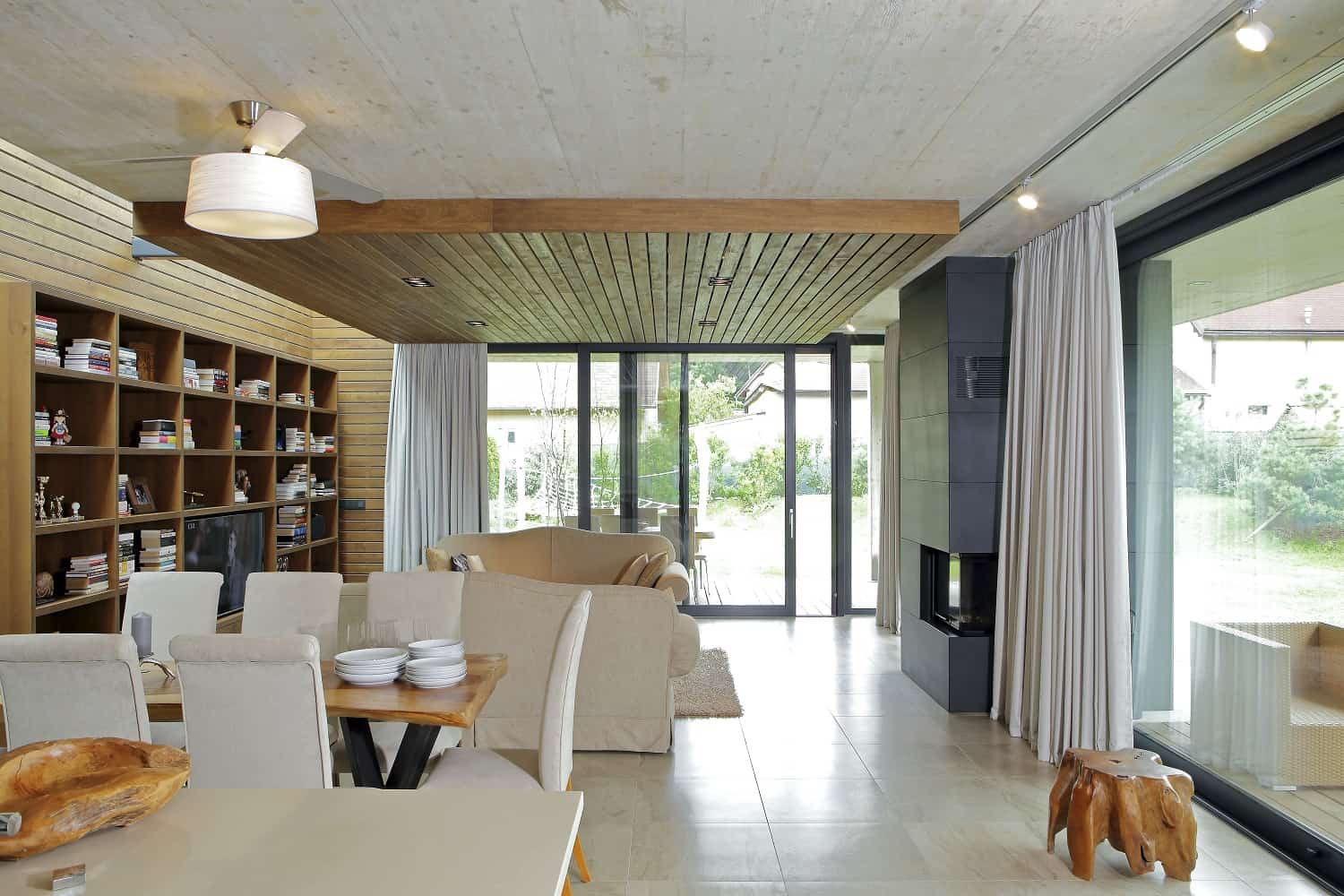 Ve vstupní hale se kříží dvě podélné osy domu svírající pravý úhel. Pokud stojíte v jejich průsečíku, snadno přehlédnete logicky členěnou denní i noční zónu stavby určené k relaxaci po náročných pracovních dnech strávených v hlavním městě.