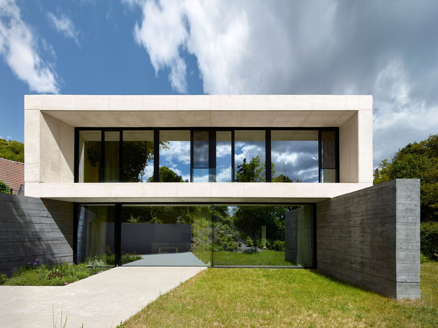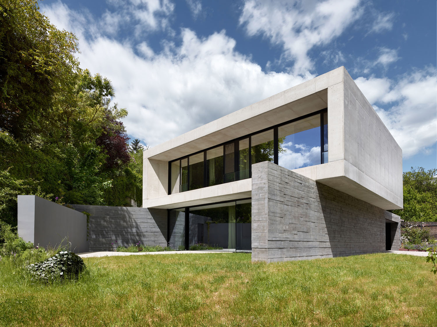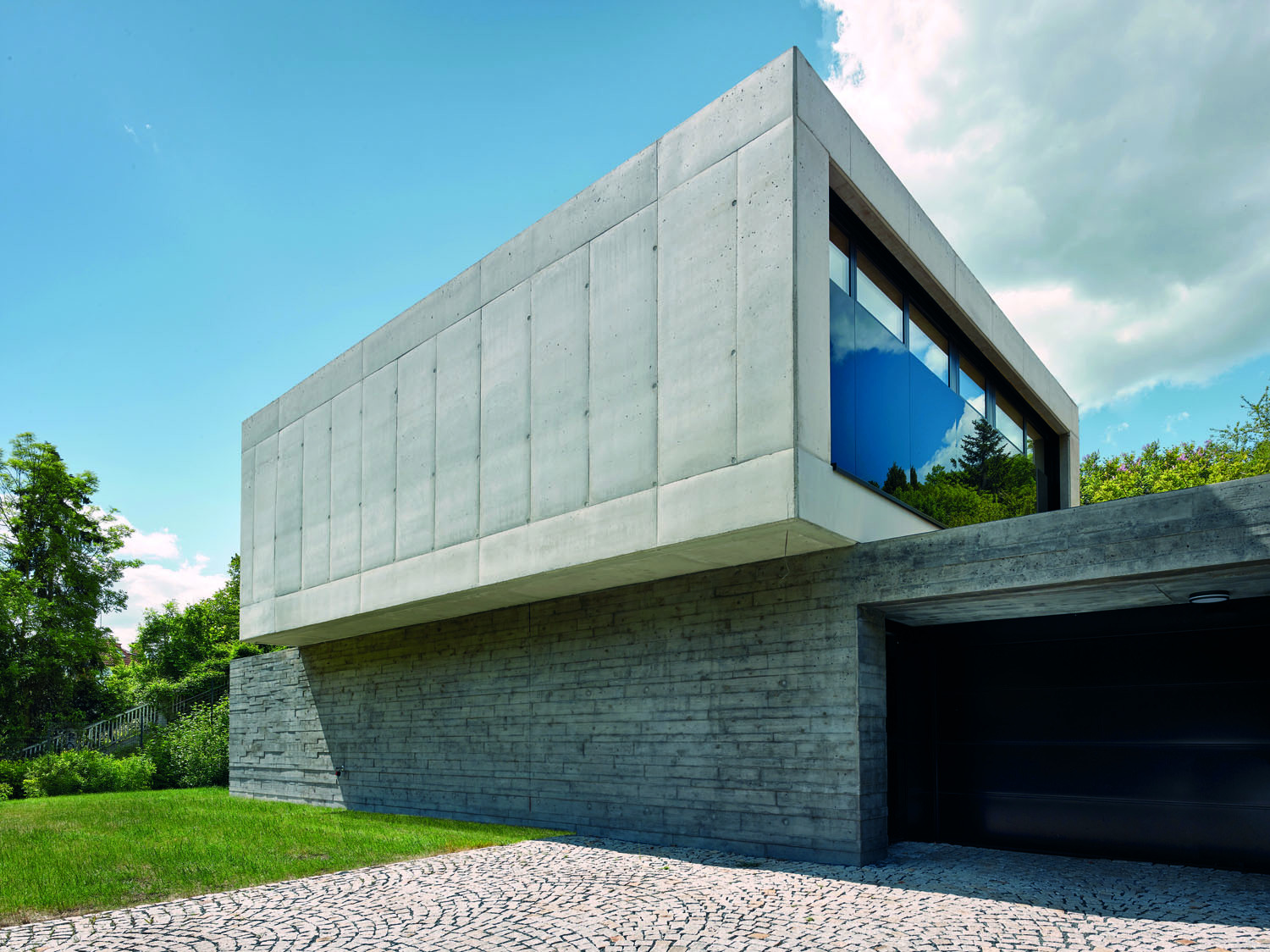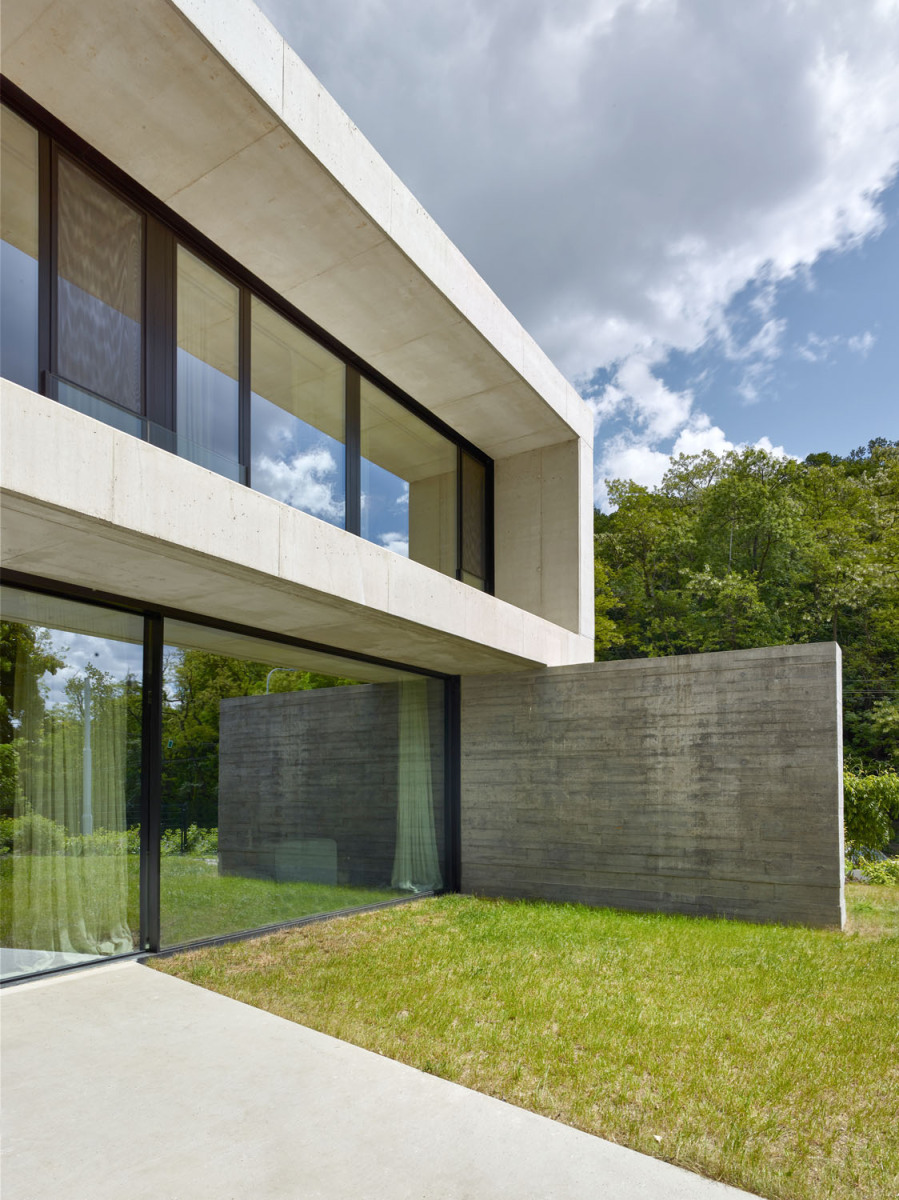 Tento dům měl ojedinělé zadání, jeho majitelé si přáli, aby byl pokud možno celý odlitý z betonu. Požadavek tedy nebyl v dispozicích, ale v materiálu. V pražské Troji tak vznikla vila, na niž autoři použili hladký pohledový beton s přidaným bílým cementem a tmavší s černým pigmentem, který je také více plastický díky zvolenému typu bednění. Dům má díky tomu dvě části, nad plastickou podnoží masivních tmavých zdí se vznáší bílá hmota.