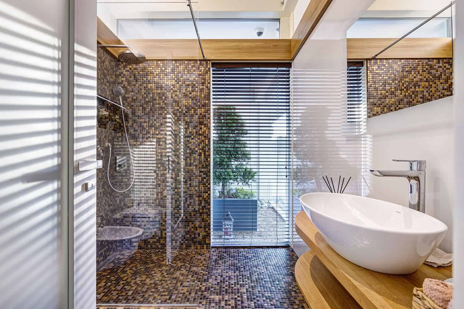 ▪ Podlahy: V ložnicích je dubová olejovaná podlaha (Princ Parket), v chodbách a pobytové zóně je velkoformátová kompozitní dlažba 1,5 x 3 m, v koupelnách je mozaika