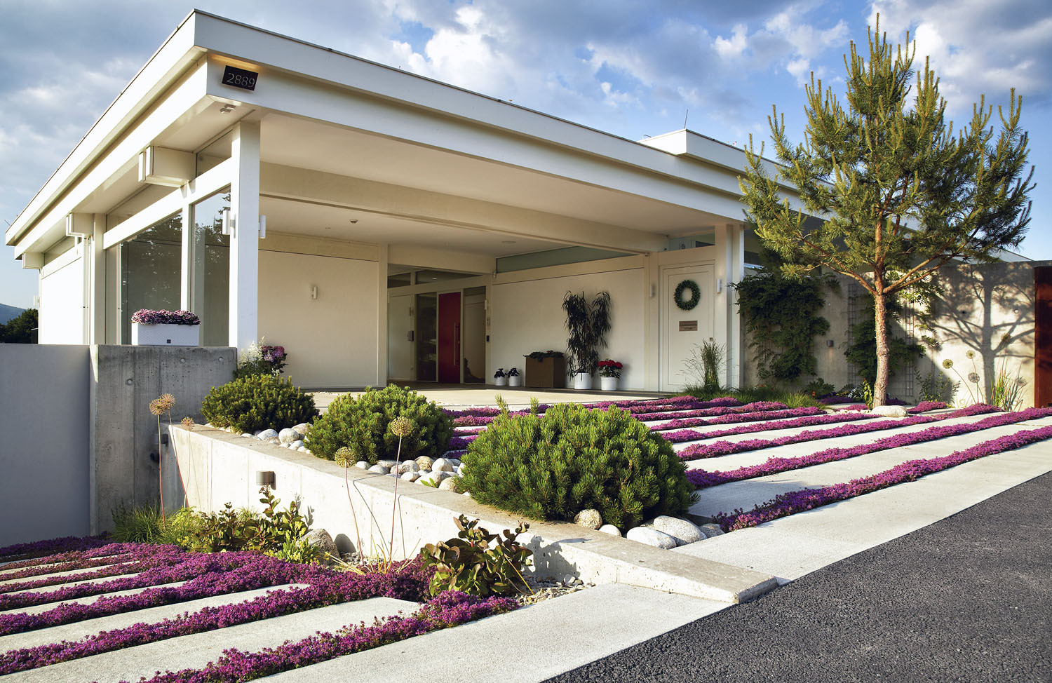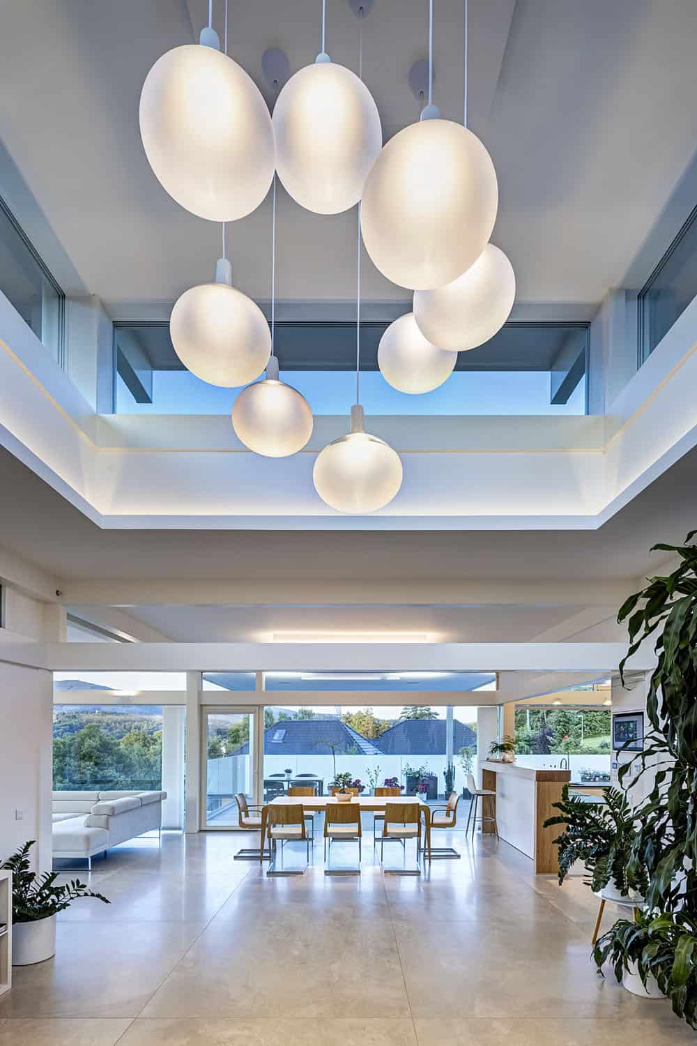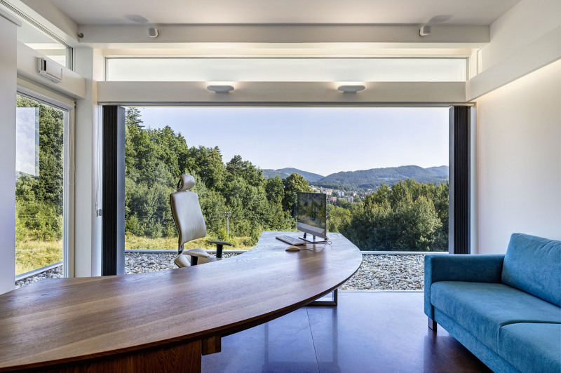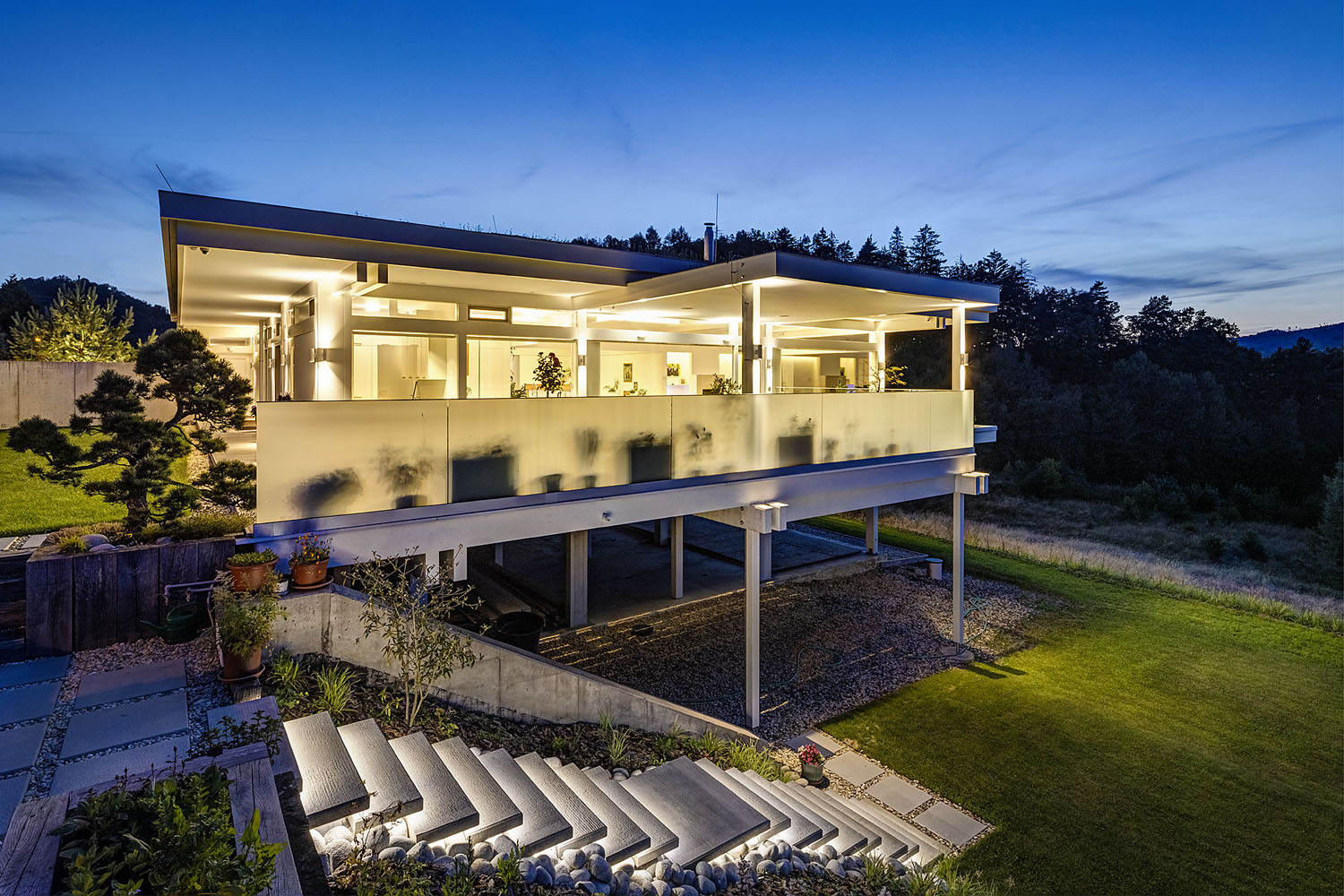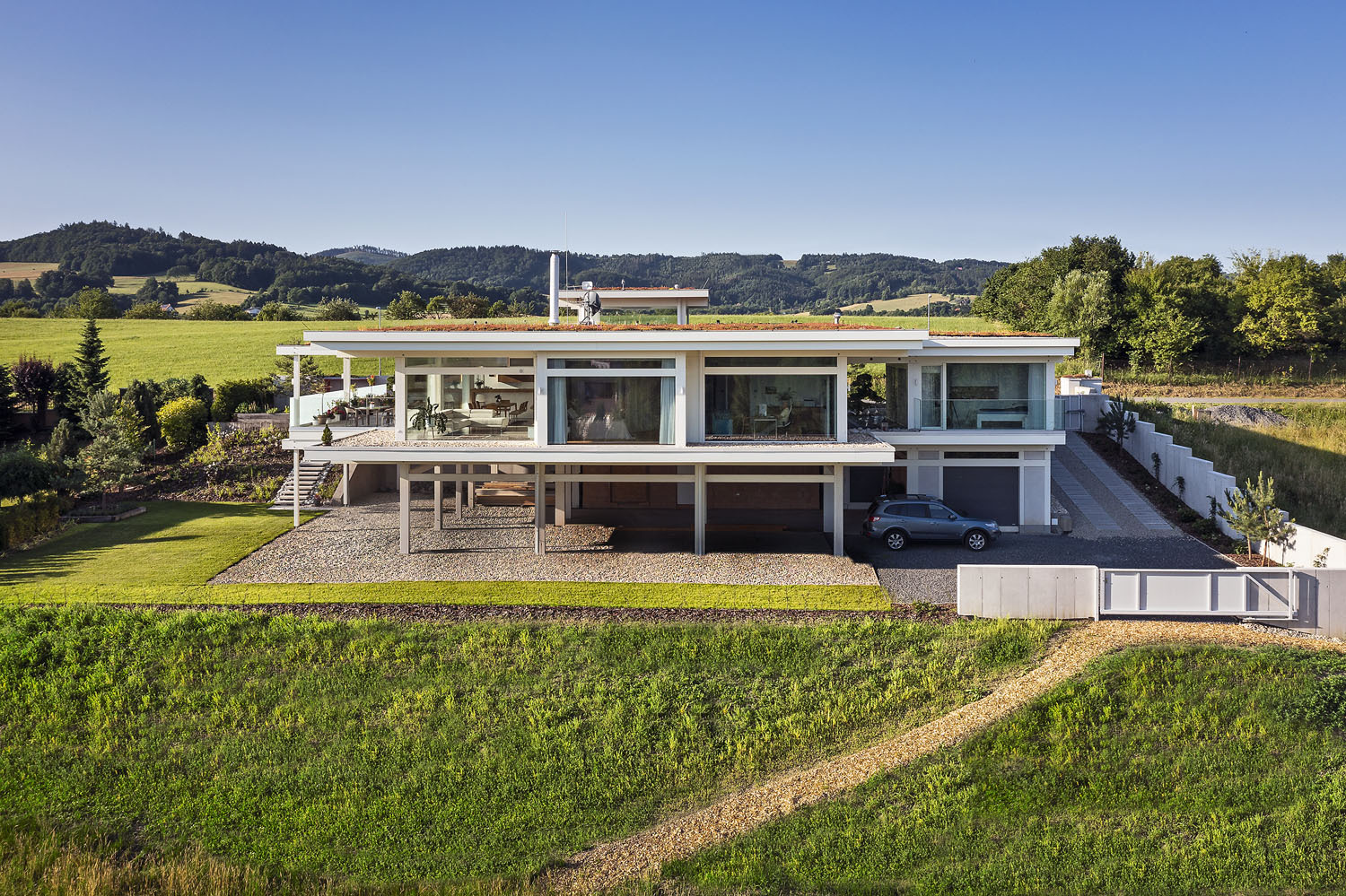 Dům je vyvěšený ve svahu, to znamená, že od příjezdové silnice působí jako bungalov s nadsvětlíkem, ale při pohledu zespodu působí velmi odlehčeně, jako by byl zavěšen v prostoru.
