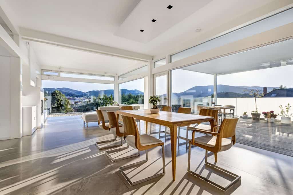 Na hlavní obytnou místnost navazuje venkovní zastřešená terasa s proskleným zábradlím, orientovaná na východ.