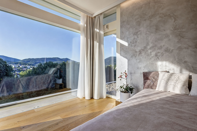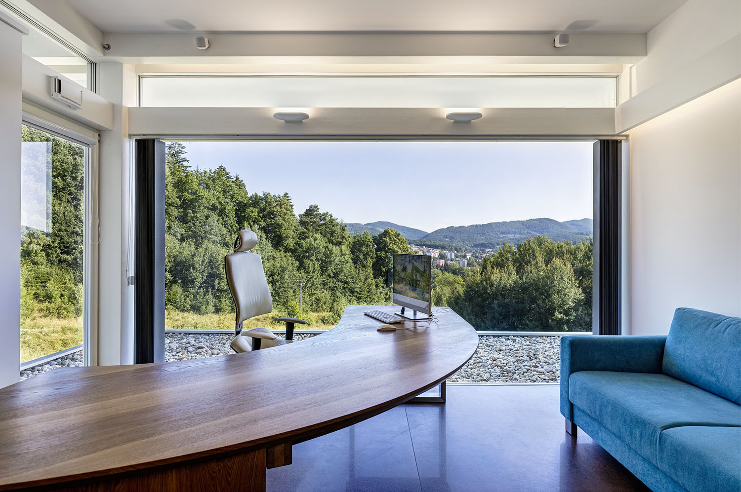Ložnice je od hlavní obytné místnosti oddělena dvojími protihlukovými dveřmi. Má opět velkorysé prosklení směrem na Beskydy a Radhošť.