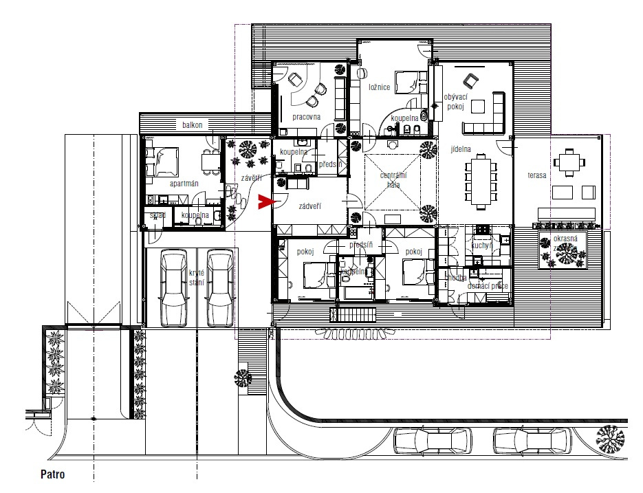 Cesta do domu vede přes otevřené parkování pro dvě auta, odkud je zároveň přístup k malému příručnímu skladu v přístavbě a ke dveřím do hostinského pokoje s velkým balkonem, kuchyňkou a sociálním zařízením. Ve vstupní partii vás přivítá pohled na bonsaj s průhledy na hřebeny Beskyd. Jako hlavní vstup do domu slouží atypické červené dveře s velkým nerezovým madlem (dají se otevírat kódem, klíčem, čipem nebo na dálku), které vedou do prostorné předsíně. Předsíň je koncipovaná tak, aby se do ní vešla i větší návštěva. Hned u vstupu je převlékací skříň skandinávského typu, což je v podstatě malá šatna s osvětlením, vytápěním a odsáváním vzduchu, kde se můžete posadit, odložit mokré boty a bundu (například po lyžování) a při odchodu si berete suché, příjemně teplé a vyvětrané věci. Mimo převlékací skříně zde najdete i další prostorné a hluboké vestavné skříně a šuplíky, od země až do stropu.