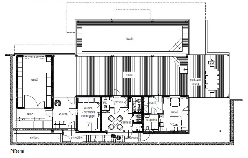 Dům je dole ze dvou třetin otevřen a tato část je nyní ve fázi budování. Zde se nachází technické zázemí, kotelna s tepelným čerpadlem, servery, a filtrační jednotky pro bazén. K tomu přináleží kolárna a sklad zahradní techniky, který v případě velkých mrazů poslouží jako garáž pro auto. Je tu i místo pro uložení briket a topného dřeva a betonový studený sklep, kde se dají uložit jablka, brambory, zavařeniny, kysané zelí či nápoje.