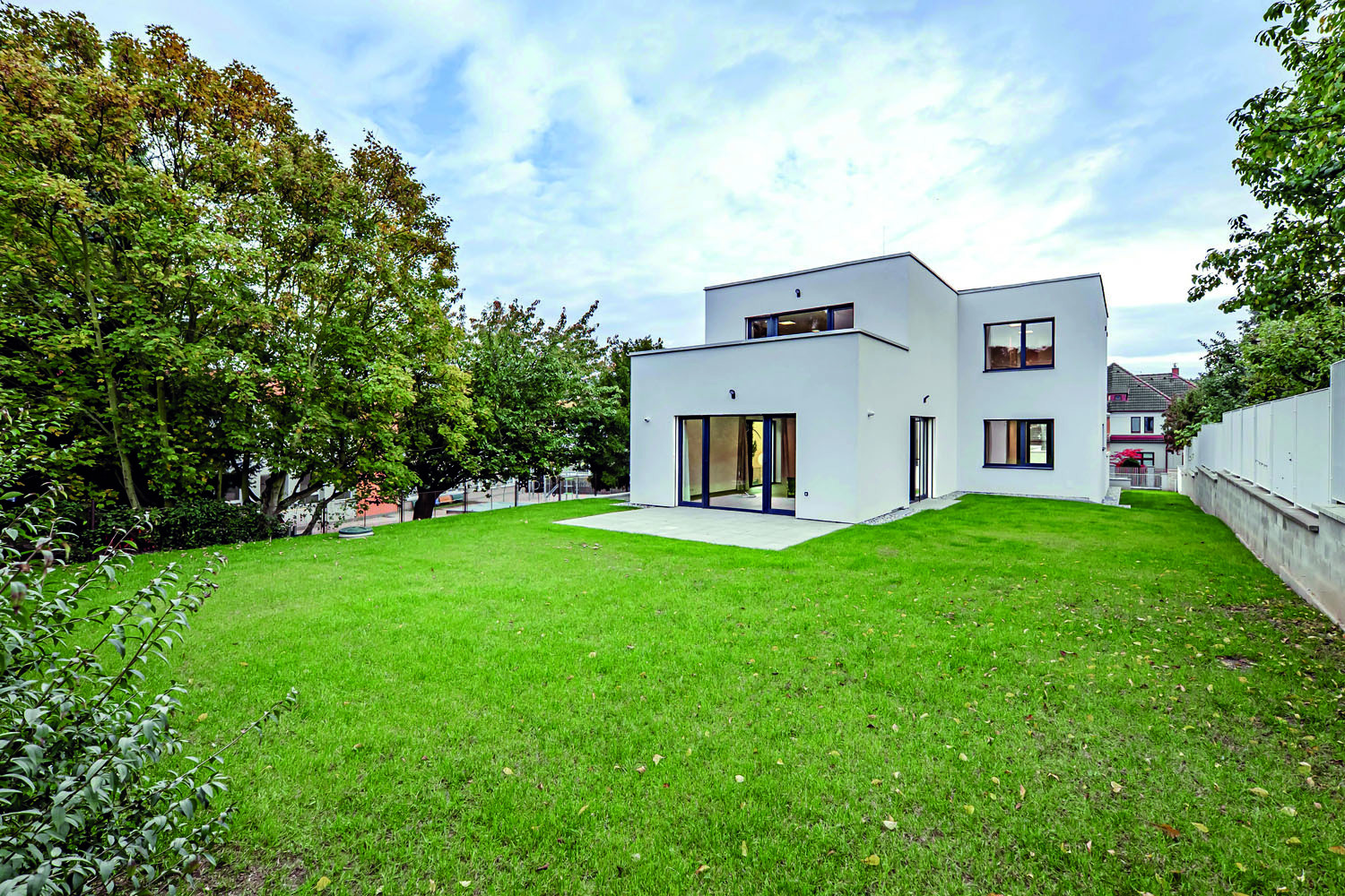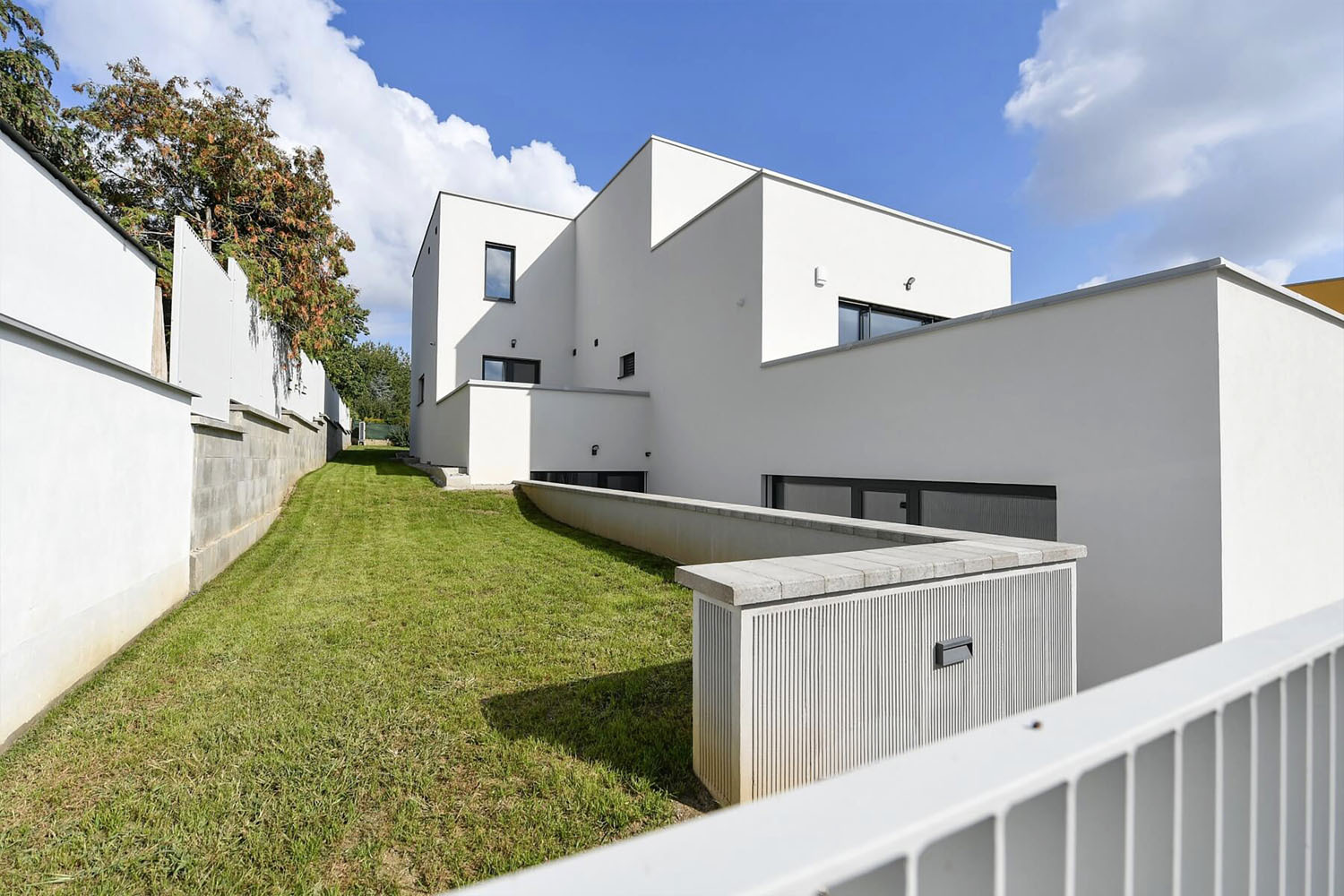 a v samotném středu zahrady je dvoupodlažní. Stavba se drží v jednoduchých obdélníkových tvarech s plochou střechou.“