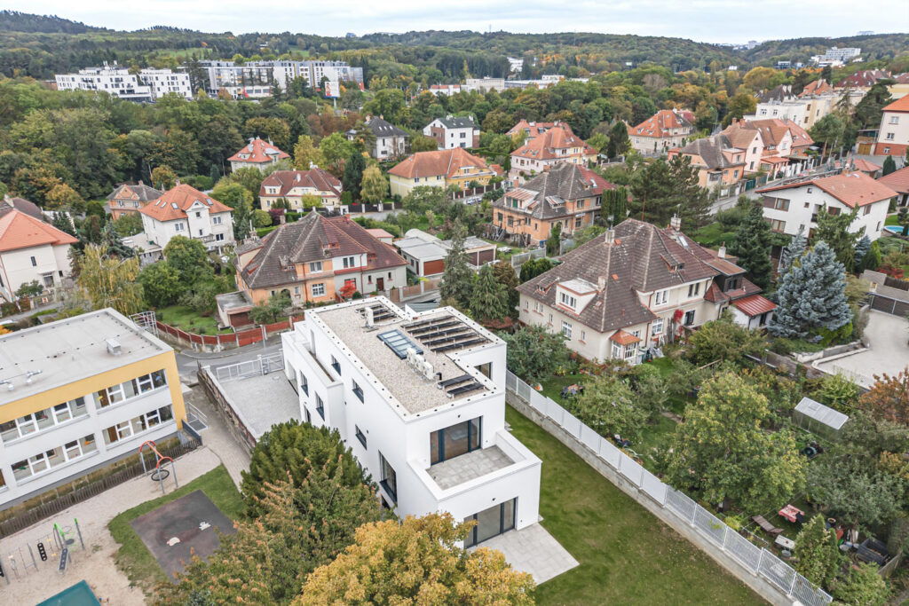 Dům na složitém atypickém pozemku využívá charakter stoupajícího terénu. Architektka Štěpánka Hájková do klidné vilové pražské čtvrti usadila novodobou pohodlnou terasovou vilu se dvěma samostatnými byty, které kromě dvou schodišť propojuje také domácí výtah.