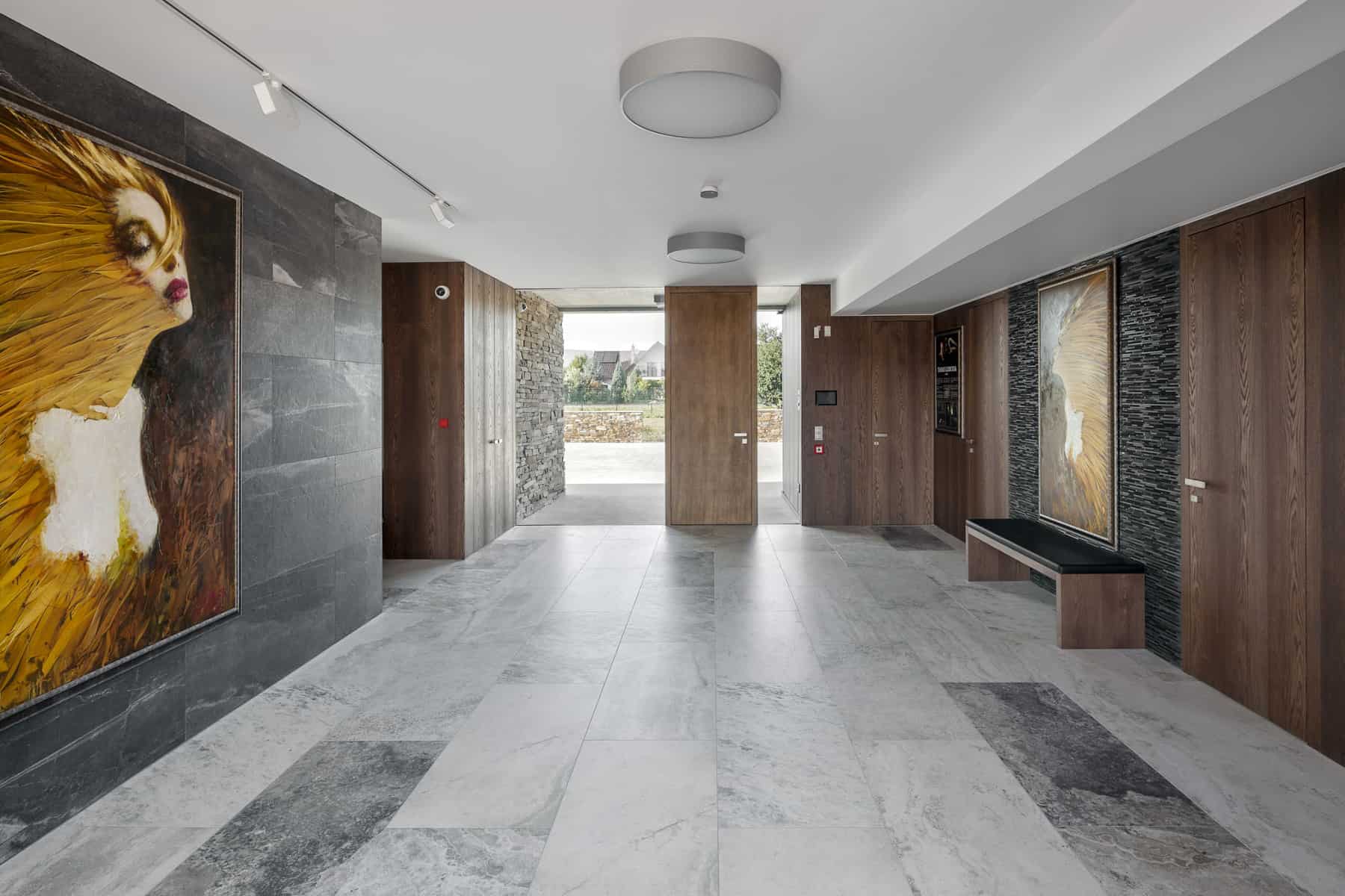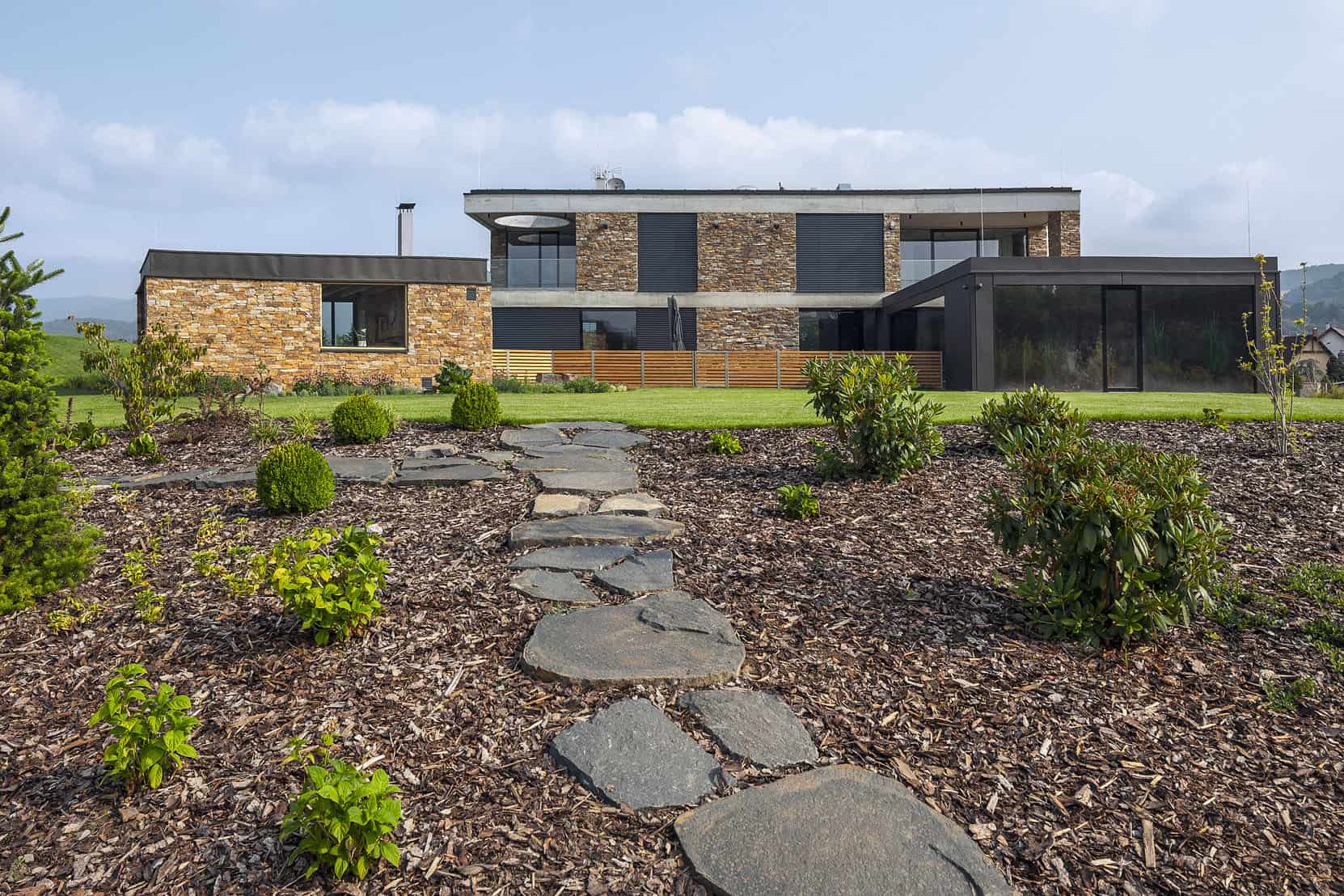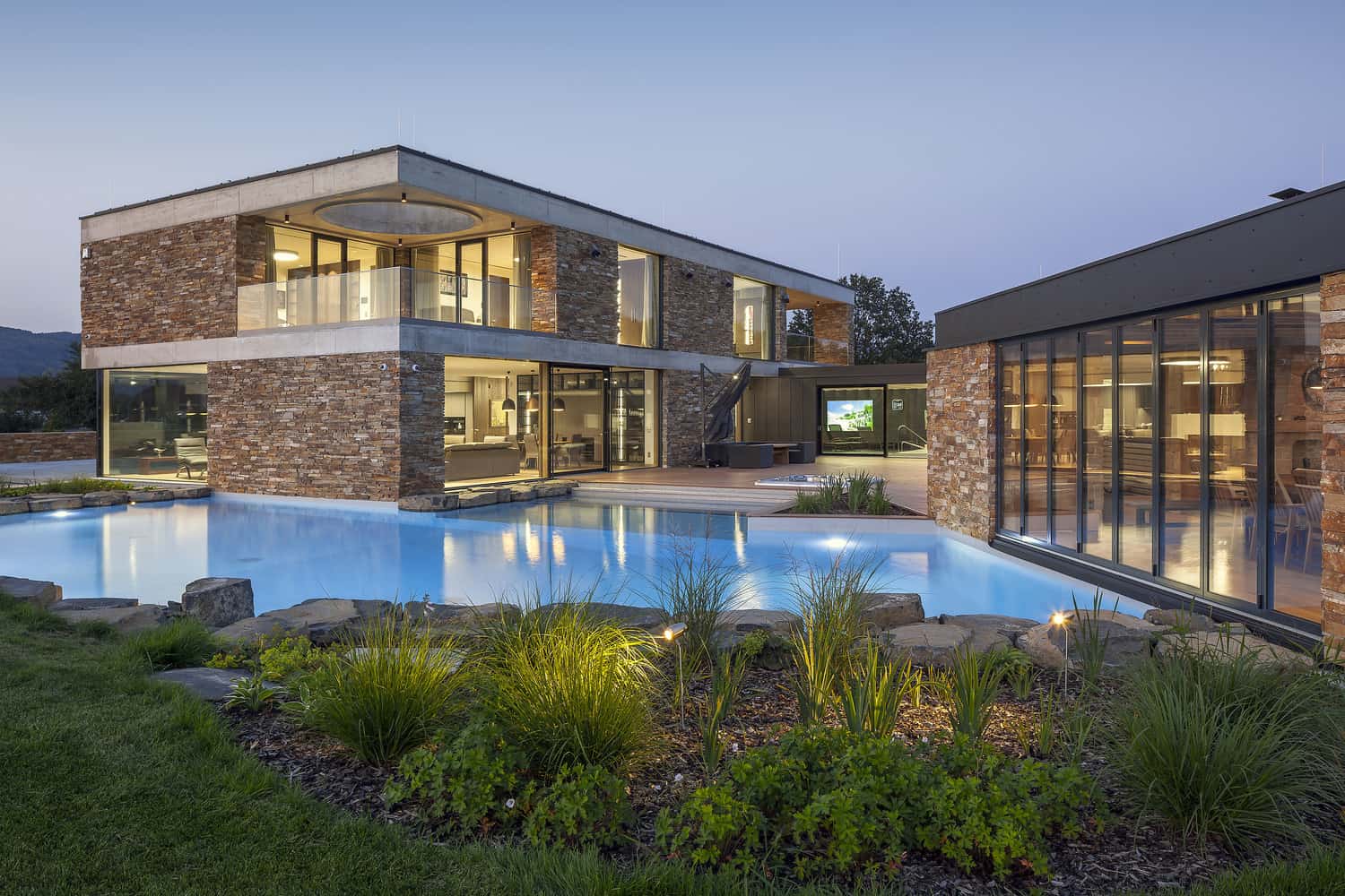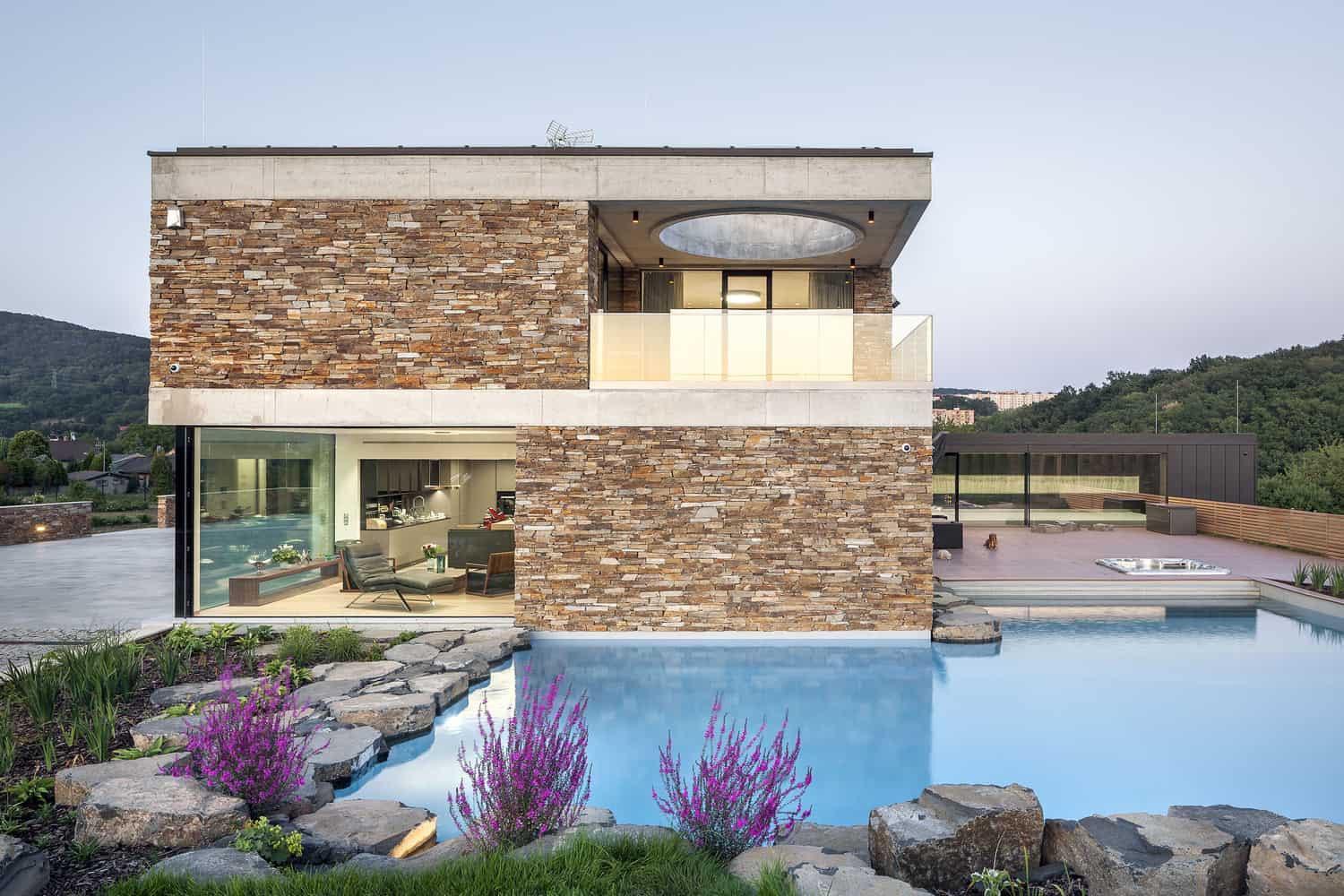 Architekt Petr Dobrovolný, autor návrhu, vypráví: „Původní projekt nám posloužil jako určité vodítko ohledně druhu a počtu místností. Zadáním byl komfortní dům pro čtyřčlennou rodinu, s krytým bazénem, velkoprostorovou garáží pro 8 automobilů a s obytnou terasou včetně letní kuchyně pro grilování s přáteli. K hlavním požadavkům patřilo i maximální soukromí, hodně světla a krásné výhledy do krajiny. My jsme do zadání „přidali“ vodní plochu a přejmenovali projekt na dům na jezeře. Navrhli jsme řadu nejrůznějších variant, od přízemního až po čtyřpodlažní objekt, různé kombinace materiálů na fasádě i v interiéru. Postupně jsme dospěli k řešení, které je symbiózou přání investora a našich představ o souznění architektury a okolního prostředí.“