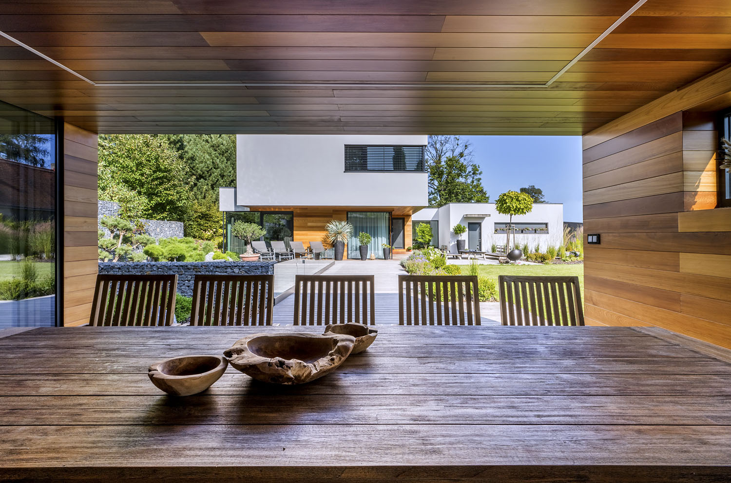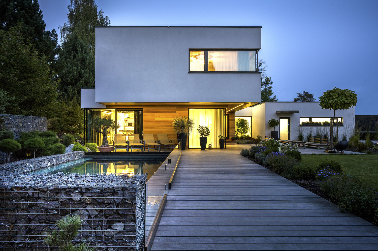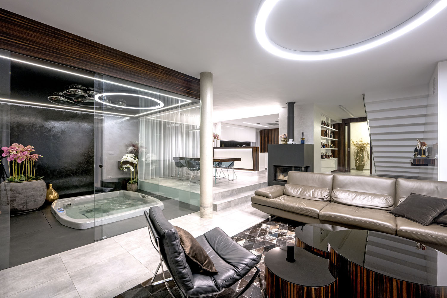 Na tomto rodinném domě jistě prvoplánově každého zaujme vířivka uprostřed obývacího pokoje. Takových domů u nás mnoho není, ale to je jen nejmarkantnější znak, kterým se tato stavba odlišuje od vyššího standardu, který obvykle představují stránky life stylových časopisů. Promyšlená provozní, vizuální i designová návaznost vnitřního wellness prostoru na obývací pokoj, terasu s bazénem a letní kuchyni patří k unikátním řešením, spolu s designem interiéru a použitými technologiemi.