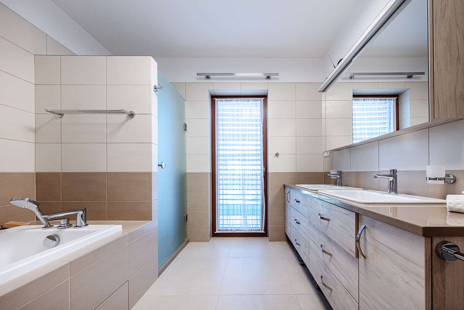 ▪ Výplně otvorů: okna hliníková s izolačními dvojskly, předokenní žaluzie na el. pohon, dveře dýhované do obložkových zárubní – plné a prosklené, + skleněné atypické