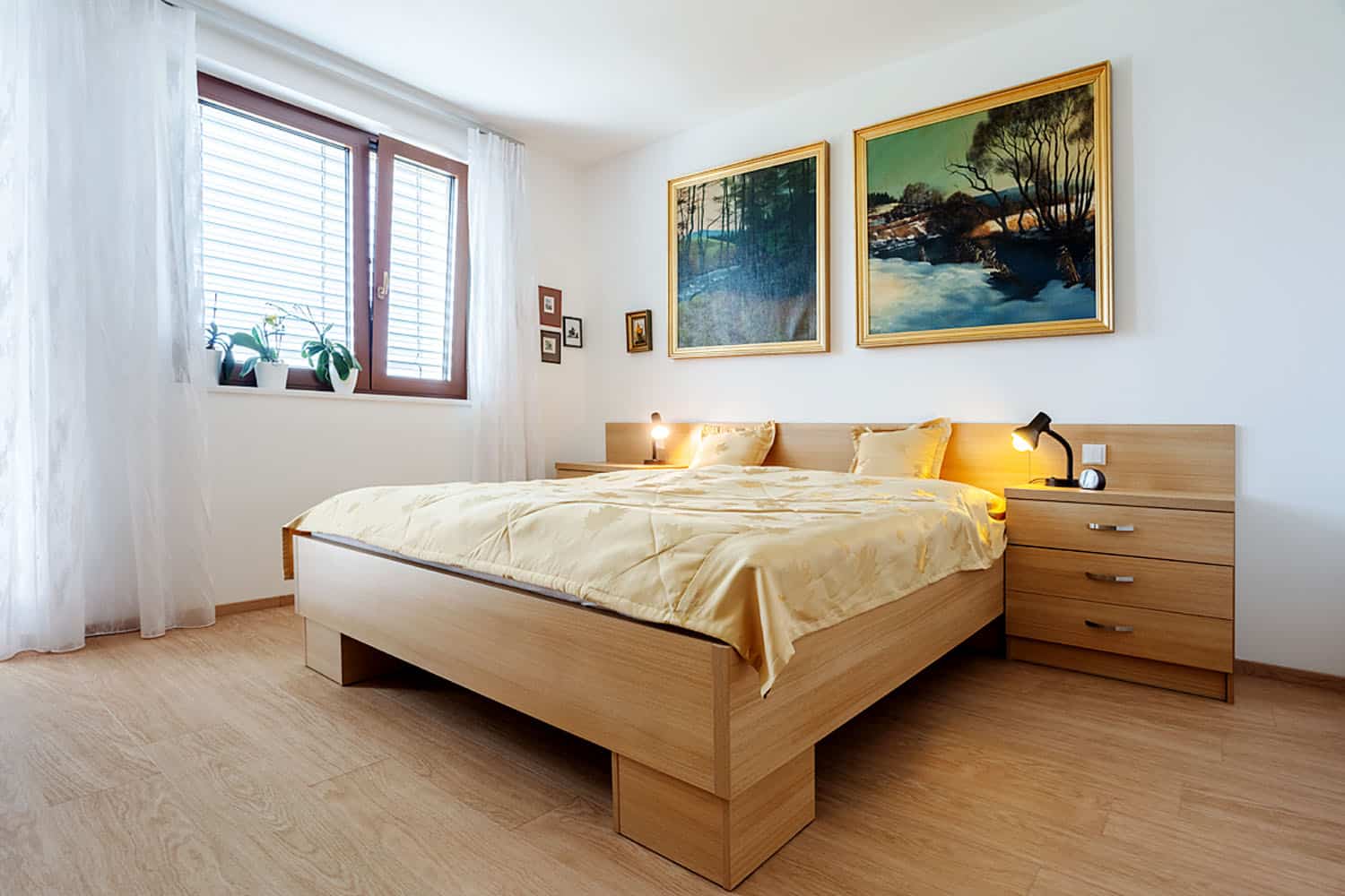 Ze společného obývacího prostoru se dále vchází do haly, která slouží jako malá domácí pracovna i jako vstupní prostor klidové ložnicové části se dvěma pokoji orientovanými do zahrady a s příslušenstvím, značně převyšujícím standard českého rodinného domu této velikosti. Tvoří je prostorná koupelna s vanou, sprchovým koutem, samostatným WC a dveřmi do zahrady, a zejména překvapivě velká praktická šatna se třemi řadami na míru vyrobených skříní.