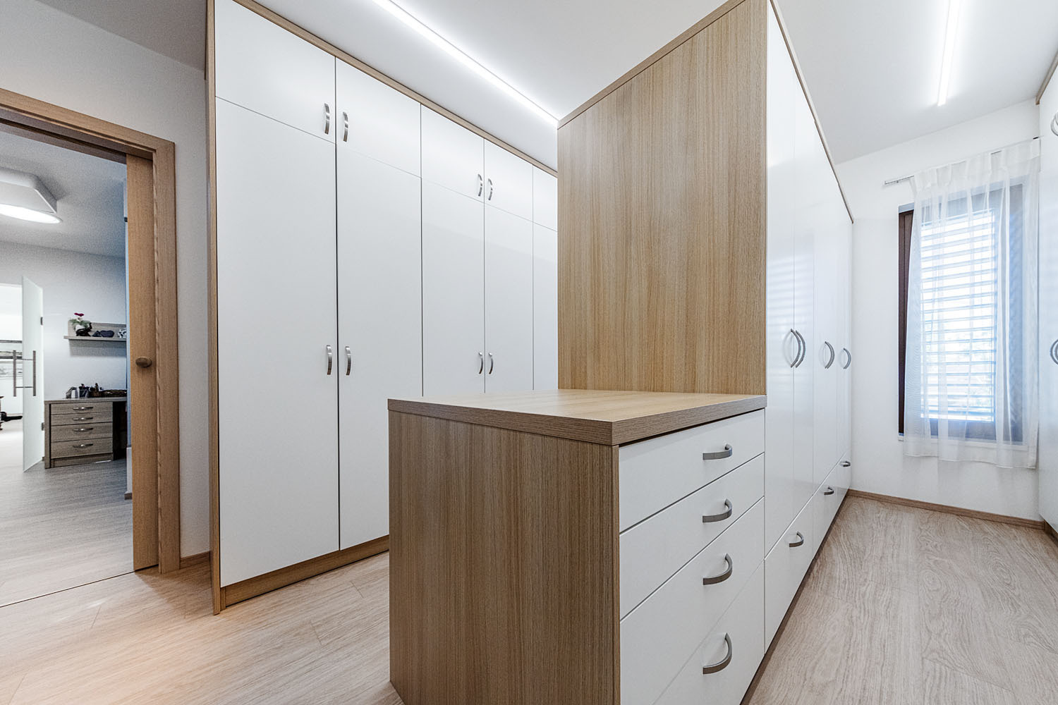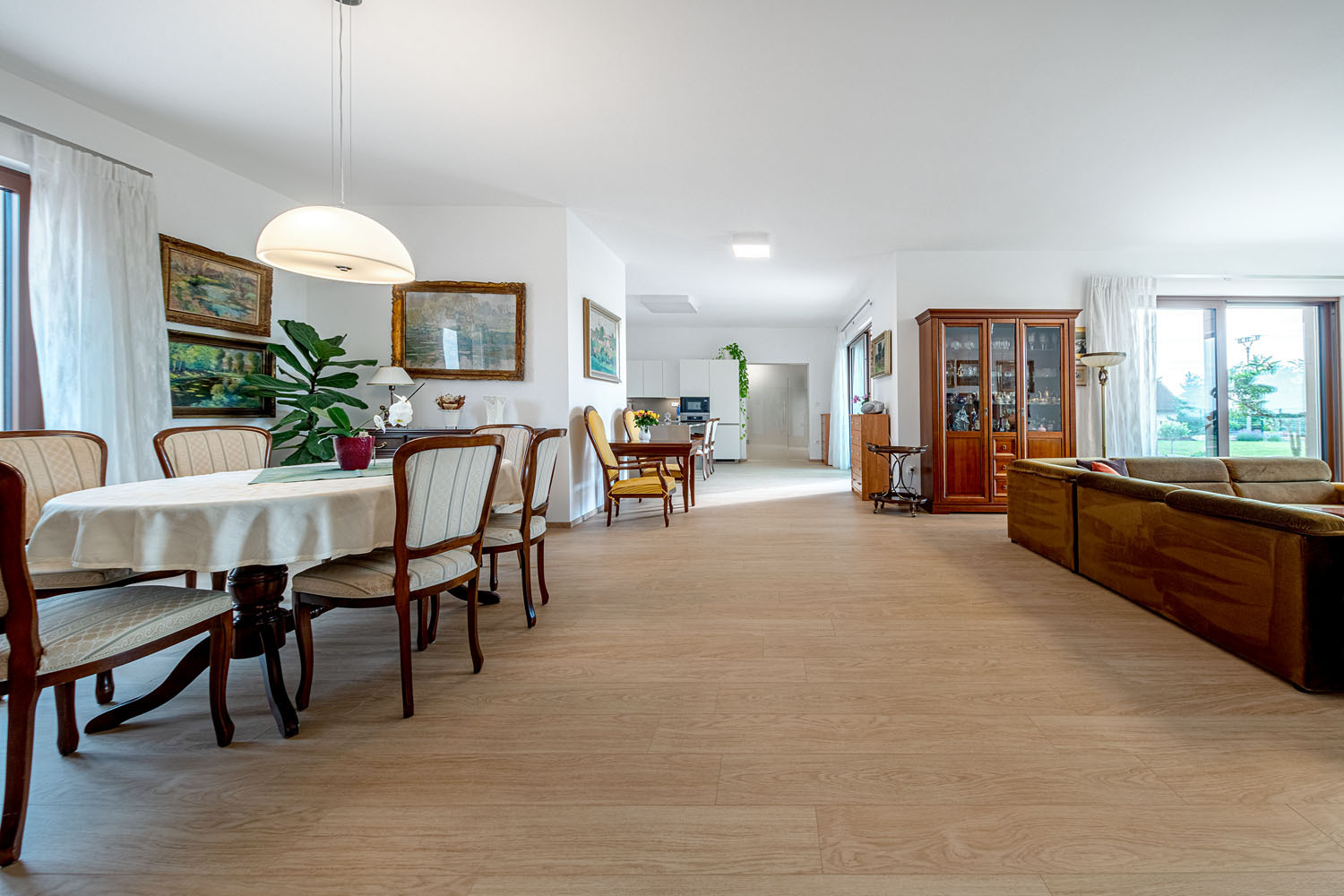 Z celého interiéru vyzařuje důraz na řád a harmonii. Je znát, že majitelé domu věnovali pozornost nejen dostatečné velikosti místností a praktickému vybavení, ale také útulnému vyznění a dostatku denního světla a slunce. Ten zabezpečují velké prosklené plochy a prosklené dveře, denní světlo má i většina místností zázemí. Tam, kde okno nebylo možné, „svítí“ shora příjemně rozptýleným jasem tubusové světlovody. Vzdušnou atmosféru podporují převažující světlé barvy, zejména kvalitní vinylové podlahy, laminované desky a teplé odstíny přírodního dřeva, z něhož byl vyroben nábytek.