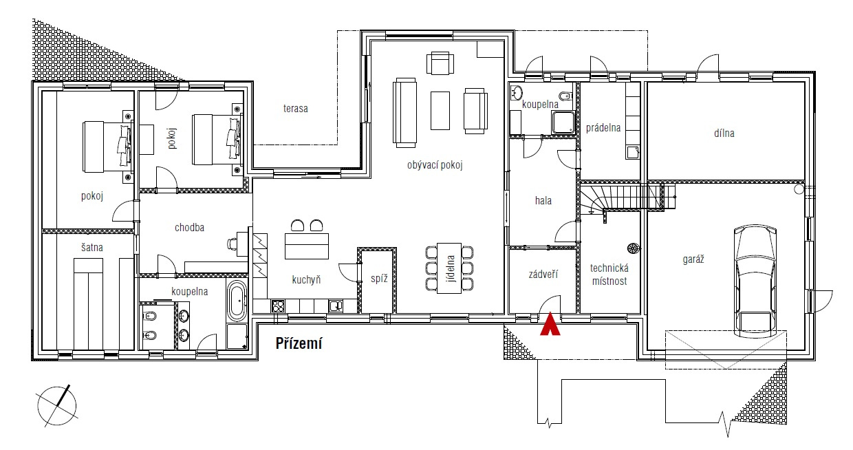Podélná dispozice je orientována ve směru sever – jih a všechny obytné místnosti mají výhled na západ do zahrady. Oproti původnímu typovému projektu se dům změnil především ve vstupní a ložnicové partii. U vstupu byla přistavěna dvougaráž a celá severní část domu byla podsklepena. Z široké předsíně se vchází do koupelny pro hosty, technické místnosti a vede odsud také schodiště do suterénu, kde se nacházejí úložné prostory a technické zázemí. Společný obývací prostor je uspořádán do tvaru L a rozčleněn na sezení s krbem, jídelnu a kuchyň. Majitelům domu se velmi líbí, že ze všech částí je přímý výhled i výstup prosklenými stěnami na příjemnou chráněnou terasu. Jídelna a kuchyň mají okno také na východ, směrem ke vstupu do domu. Nechybí ani malá spíž s oknem.