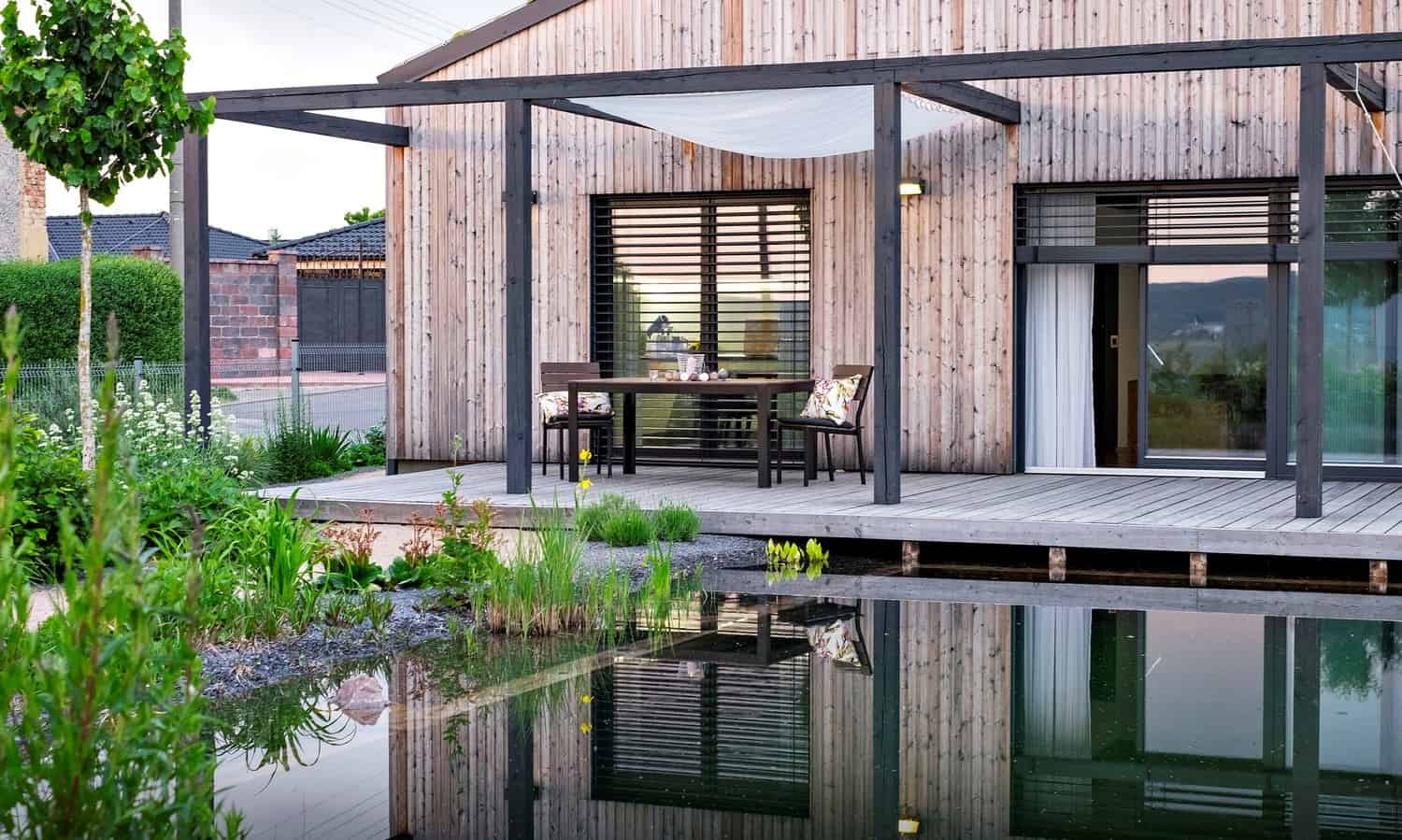 Zahrada u moderního rodinného domu se zelenou střechou nabízí pravidelné geometrické tvary zahalené divokou přírodou a poskytuje dostatek soukromí i přirozenou sounáležitost s okolím. Nejvýraznějším prvkem tohoto impozantního přírodního prostoru je koupací jezero přimknuté k prostorné dřevěné terase.