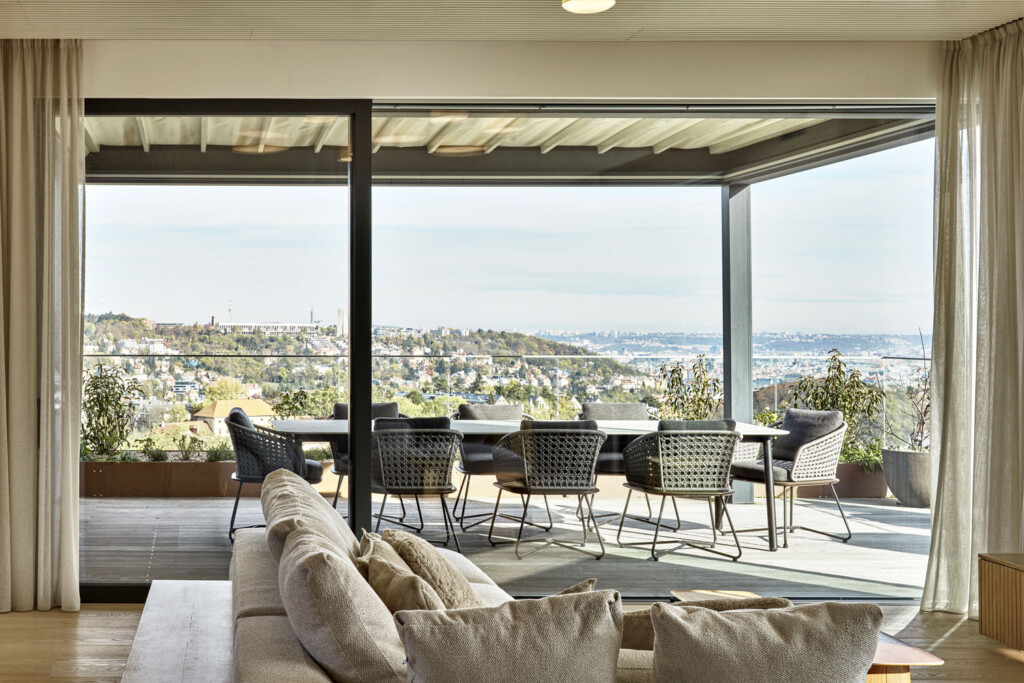 Dvoupodlažní penthouse v jedné z nových pražských čtvrtí nabízí prakticky stejný komfort jako bydlení v rodinném domě – velký využitelný prostor, soukromí, hezké výhledy a venkovní rekreační plochy na střešních terasách. Architekti z Ateliéru Kunc Architects k vybavení interiéru přistupovali podobně, jako by šlo o vilu v zahradě.
